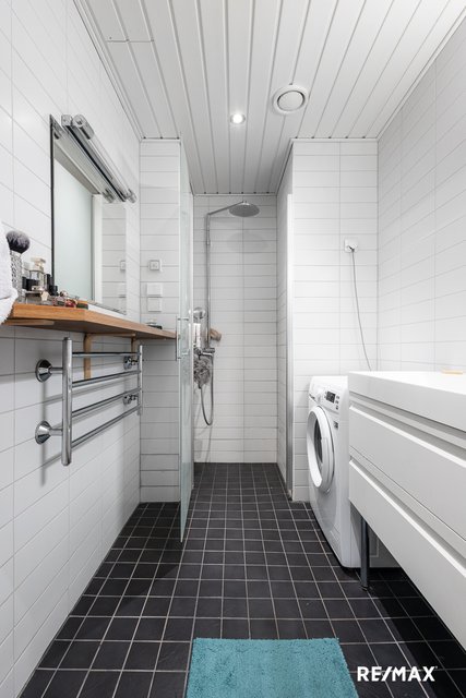 - Kokonaan laatoitettu kylpyhuone.