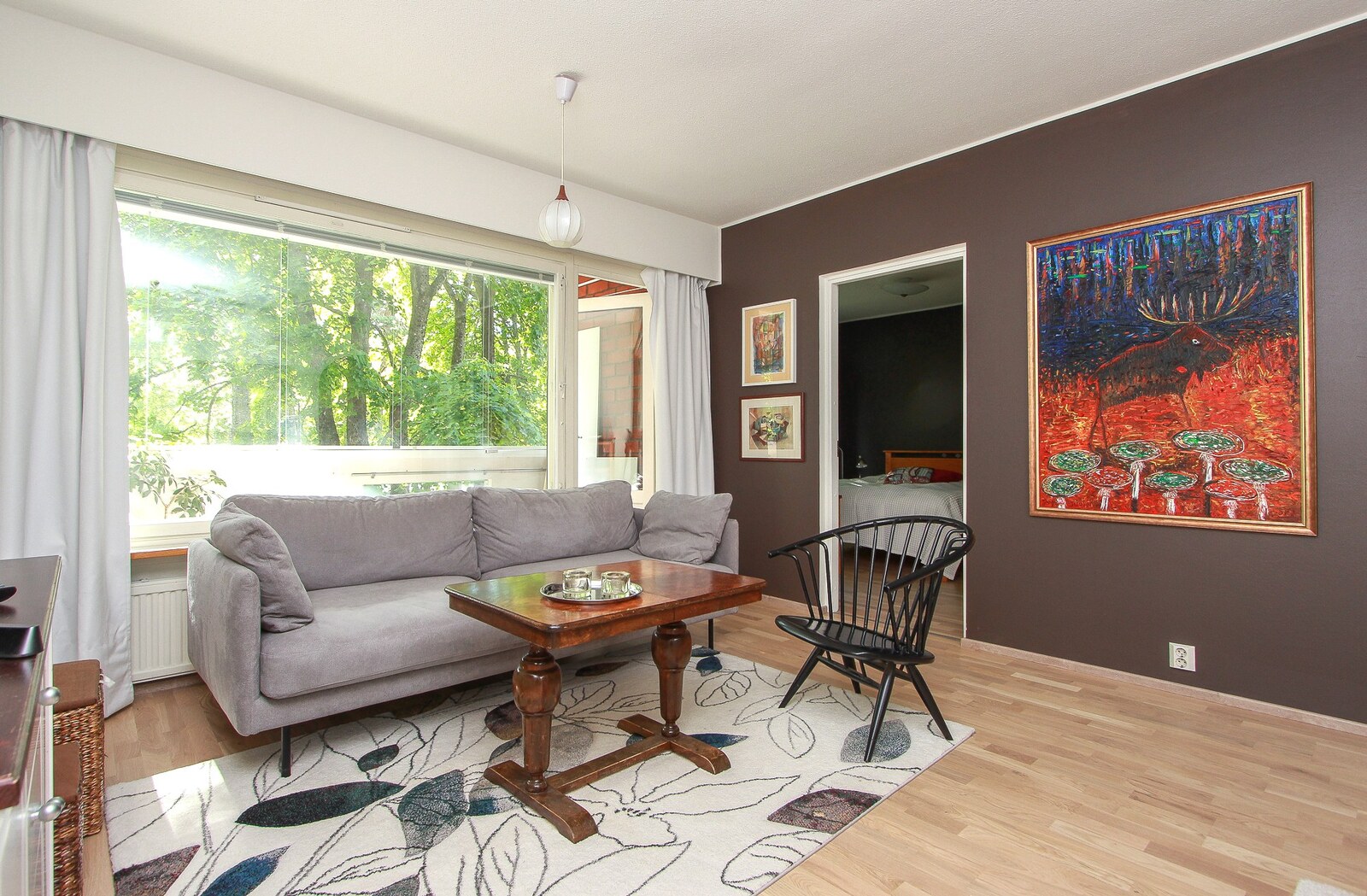 - Tilava olohuone, jossa paikka isollekin ruokapöydällä. Lasitettu parveke viihtyisänä olohuoneen jatkeena. Näkymät taloyhtiön piha-alueelle ja viereiselle puistoalueelle.