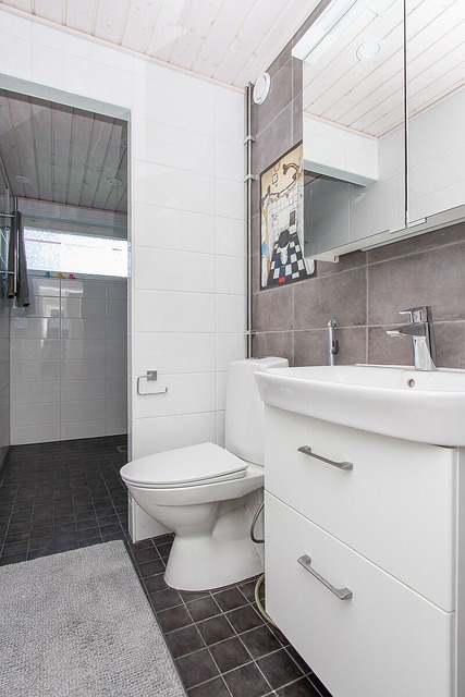 - Tilava ja tyylikäs, ikkunallinen kylpyhuone, joka remontoitu v.2021. Suihkutila ja pesukonepaikka kylpyhuoneen perällä hieman eri tilana ja Wc tila kätevästi heti kylpyhuoneeseen tultaessa.
