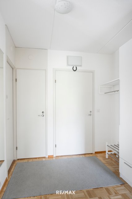 - Sisääntulo avaraan eteiseen, jossa säilytystilaa ulkovaatteille. Lattia: laminaatti Seinät: maali