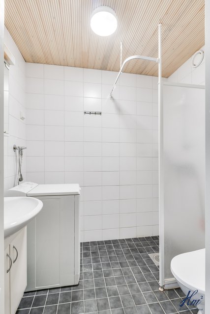 - WC-istuin, suihku, suihkuseinä, pesukoneliitäntä, allaskaappi, peilikaappi, ja pesukone