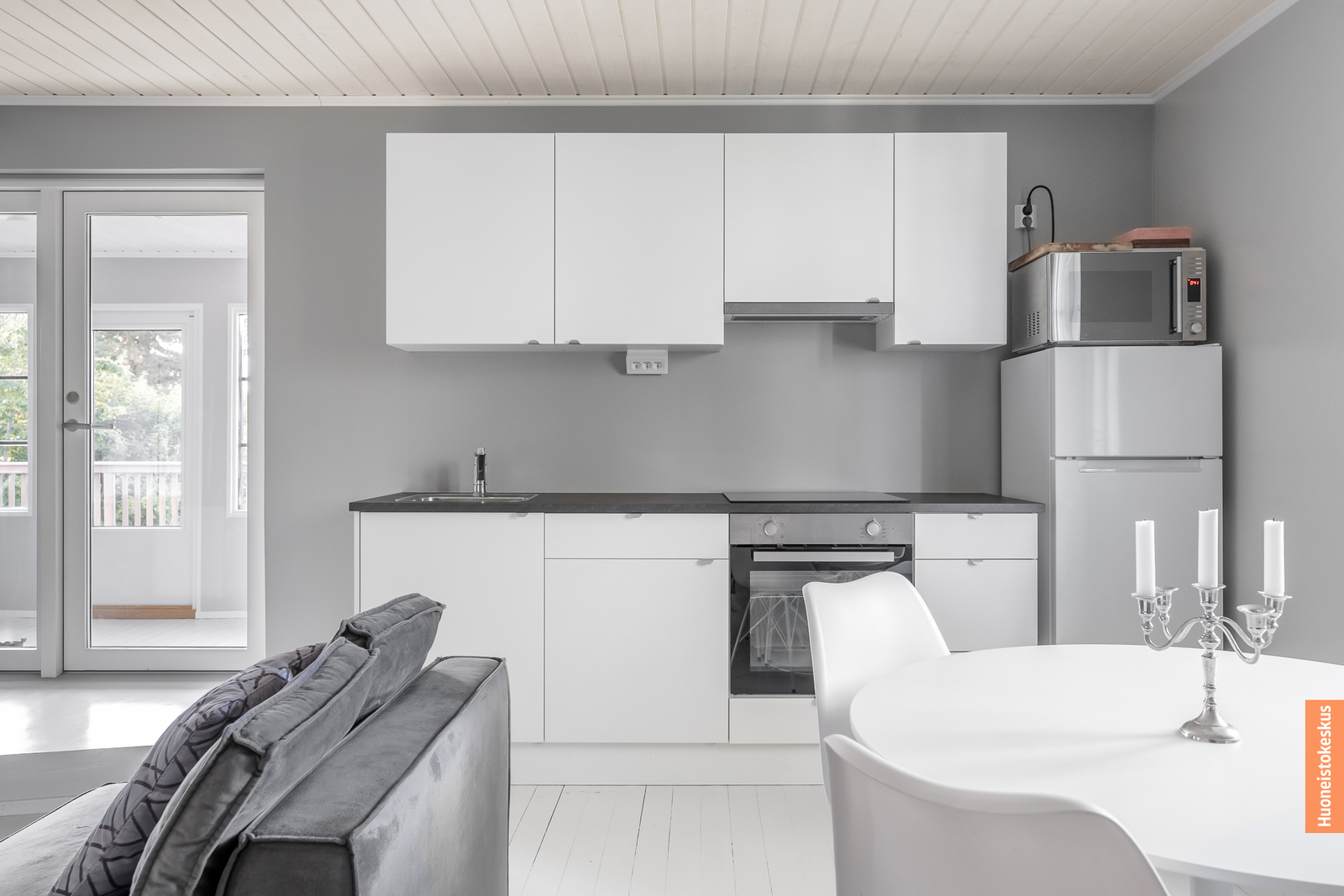 Vaaleat ja harmoniset pinnat tekevät tilasta avaran ja raikkaan kokonaisuuden. Kodin sydän on valoisa olohuone yhdessä modernin avokeittiön kanssa – avara tila, johon mahtuu helposti sekä ruokailuryhmä että viihtyisä oleskelukokonaisuus. Olohuoneesta avautuu lisäksi erillinen ”kesähuone”, joka ei kuulu asunnon virallisiin neliöihin. Tilaan on kuitenkin tehty eristys remontin yhteydessä, joten sitä voi hyödyntää mukavasti aikaisin keväästä pitkälle syksyyn. Kesähuone tarjoaa runsaasti mahdollisuuksia – sinne voi luoda tunnelmallisen oleskelunurkkauksen tai sijoittaa ruokapöydän, jossa ystävät tai perhe voivat kokoontua yhteen.