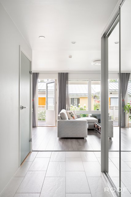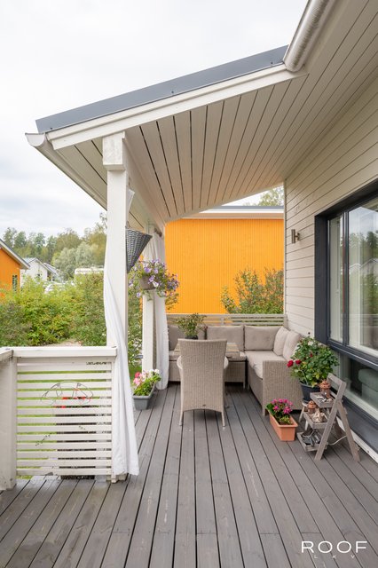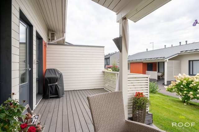 Asunnon kruunaa koko huoneiston levyinen, osittain katettu terassi etelän suuntaan sekä pieni piha-alue.