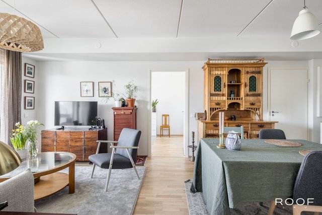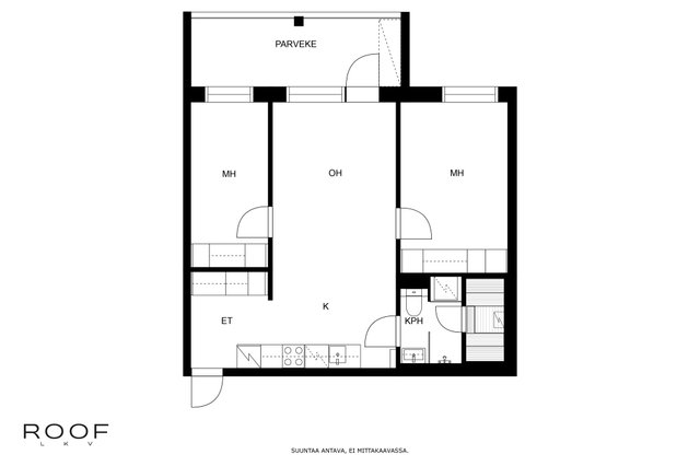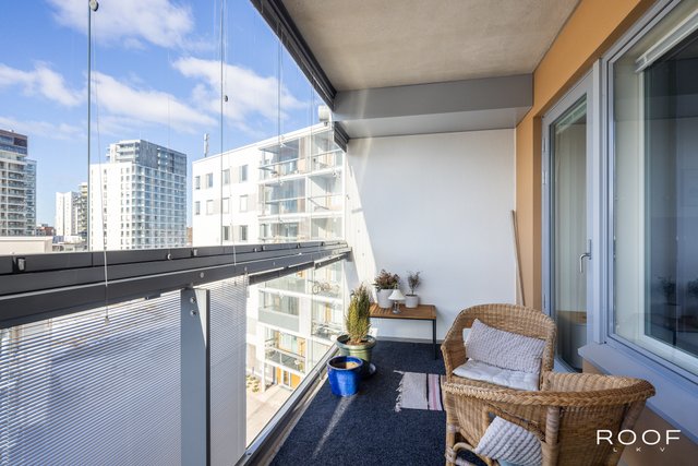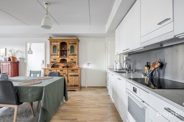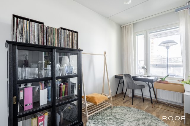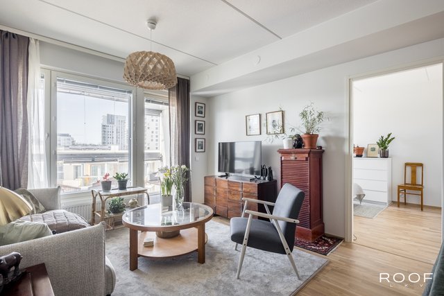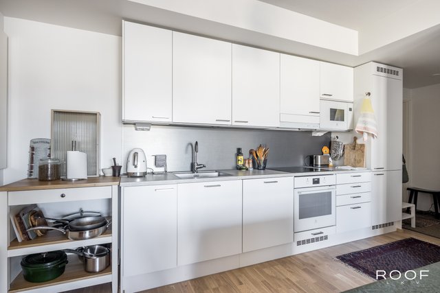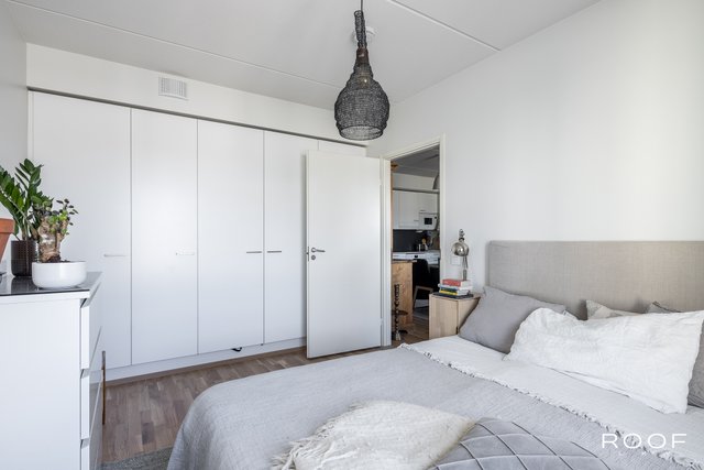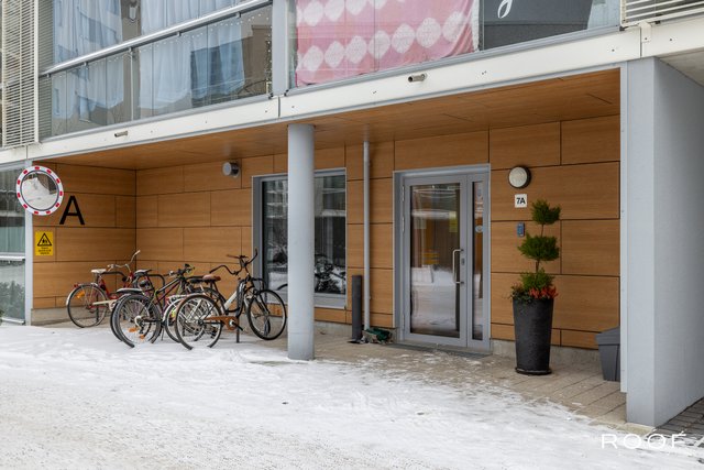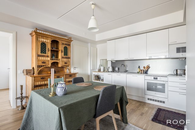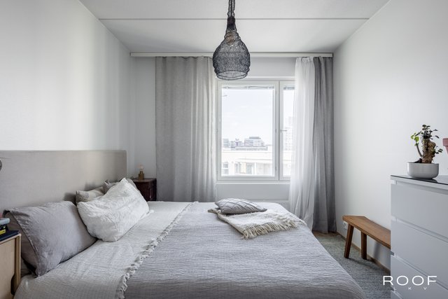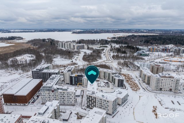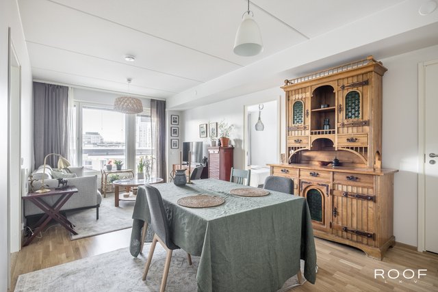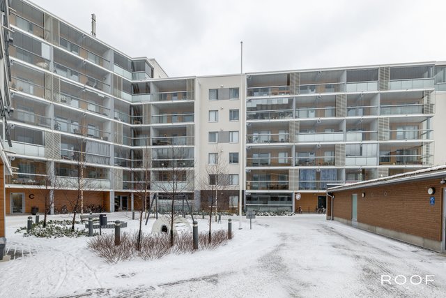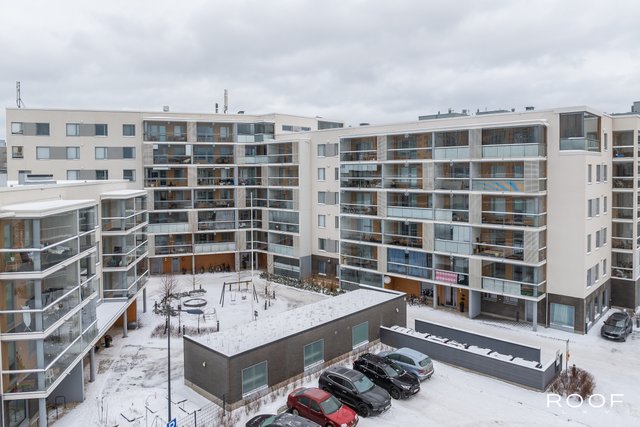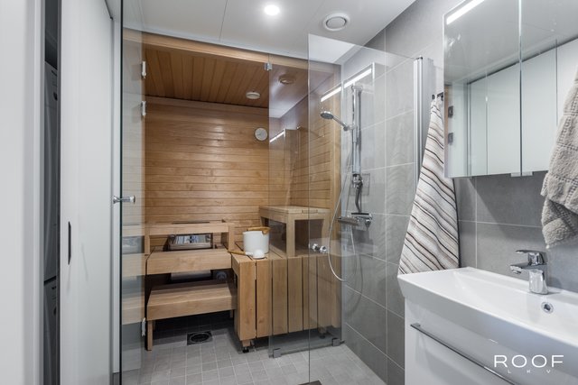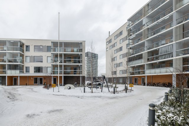 Järkevän pohjaratkaisun ansiosta huoneistossa ei ole hukkaneliöitä. Makuuhuoneet ovat eri puolella huoneistoa, huoneiston sydän on avokeittiö joka yhdistyy olohuonetilaan. Olohuoneesta on käynti lasitetulle parvekkeelle. Kylpyhuoneessa saat pesutornin siististi piiloon sille rakennettuun tilaan, kylpyhuoneessa myös seinä-wc ja lattialämmitys. Todella tyylikäs sauna kruunaa tämän kokonaisuuden. Asunnon materiaalit ovat neutraalit ja keittiö on vaalea kokonaisuus.