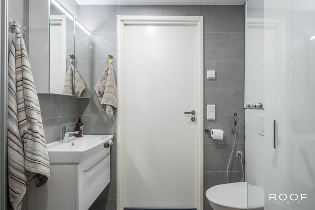 - WC-istuin, suihku, suihkuseinä, bidee-suihku, allaskaappi, peilikaappi, pesuallas, pesukoneliitäntä, ja lattialämmitys