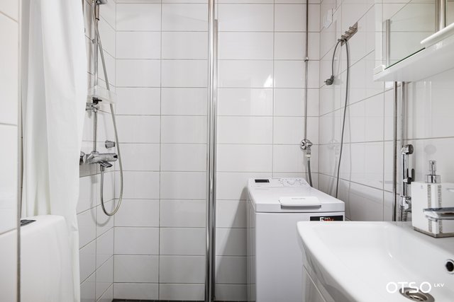 - WC-istuin, suihku, lattialämmitys, pesukoneliitäntä, allaskaappi, peilikaappi, ja bidee-suihku