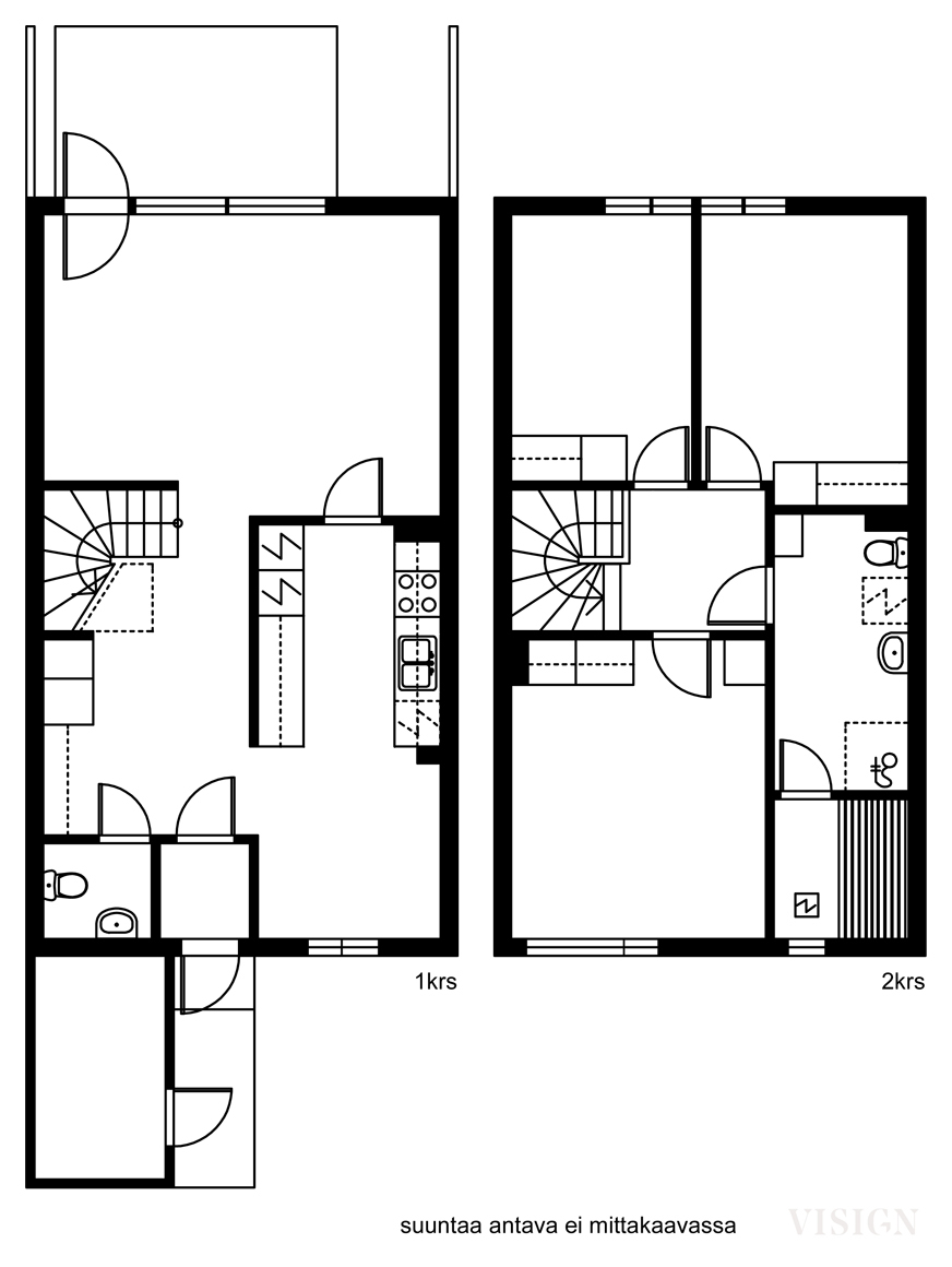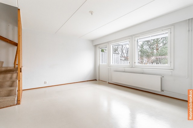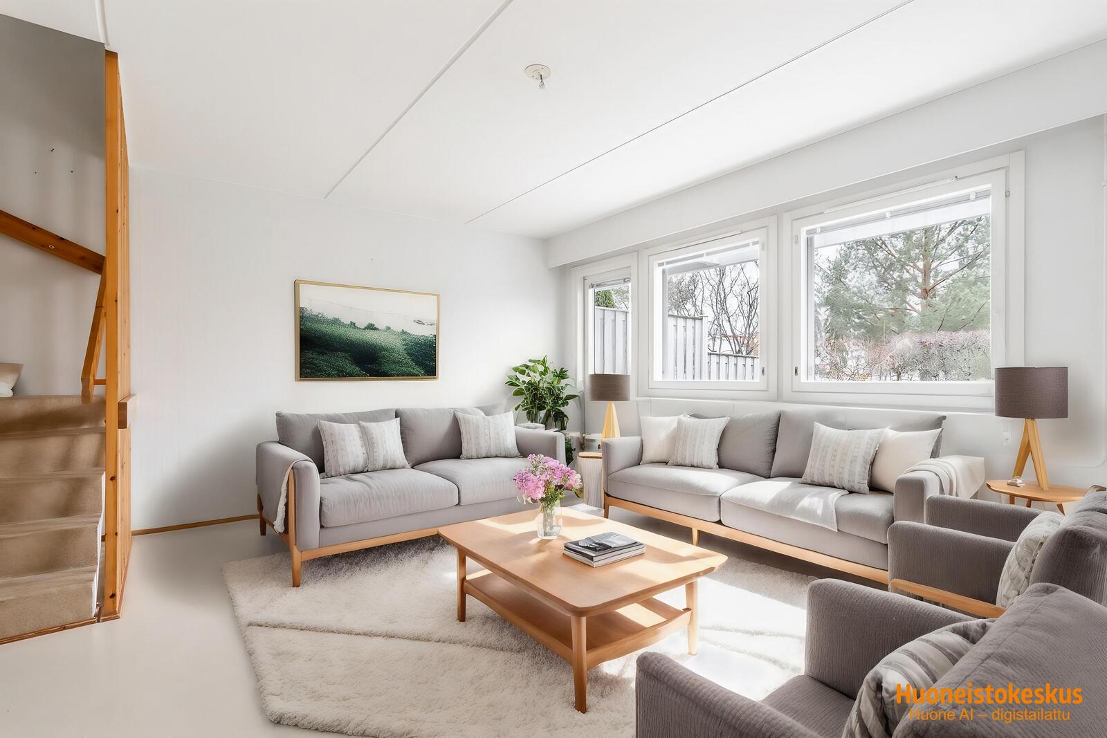 Asunnon alakerrassa on avara olohuone, joka toimii perheen kohtaamispaikkana, sieltä avautuu näkymä pihaan, josta löytyy lapsille leikkipaikka. Yläkerrassa on kolme makuuhuonetta sekä kylpyhuone ja sauna.