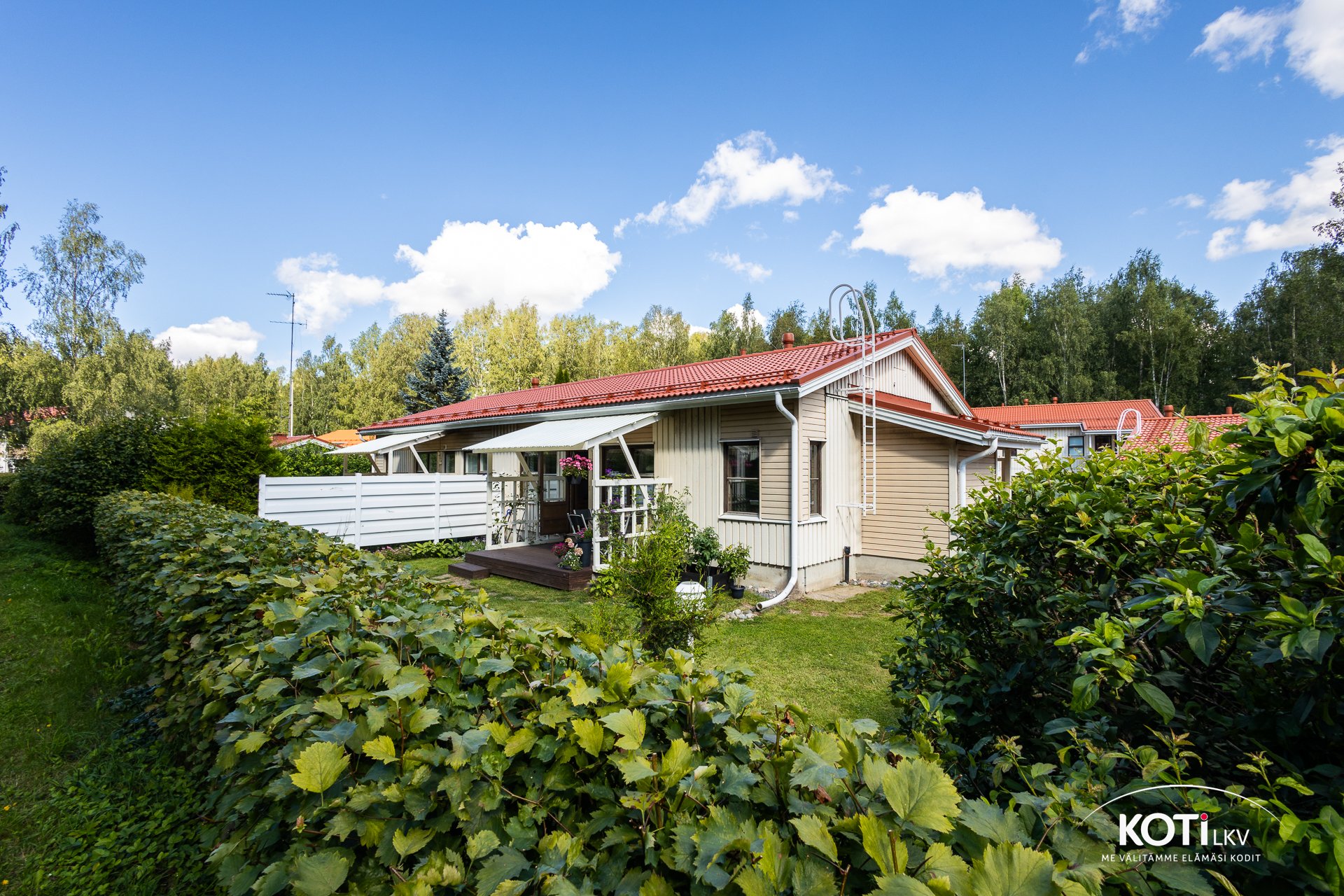 Eteisestä aukeaa kulku jokaiseen tilaan. Keittiö on mukavasti olohuoneen läheisyydessä. Olohuoneesta on käynti pihalle. Piha on päivä/ilta-auringon suuntaan. Pihalla on nurmikkoa, istutuslaatikoita, marja-aronia, raparperia, mustaviinimarjapensas, kaksi valotolppaa, terassin säleikössä kärhö/clematis-köynnös, kadunpuoleinen aitaosuus orapihlajaa. Pihalta on portti ulos.