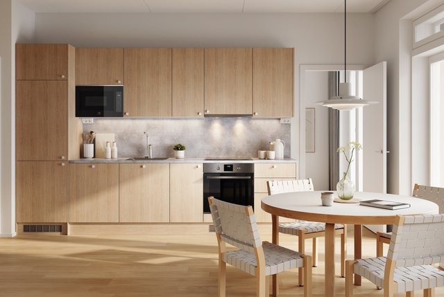Asunnon pohjaratkaisu on suunniteltu käytännöllisesti ja laadukkaat materiaalit, kuten vinyylilattiat ja keraamiset laatat, tuovat modernia ilmettä. Keittiö on varusteltu nykyaikaisin kodinkonein, ja kylpyhuoneessa on mukavuutta lisäävä lattialämmitys.