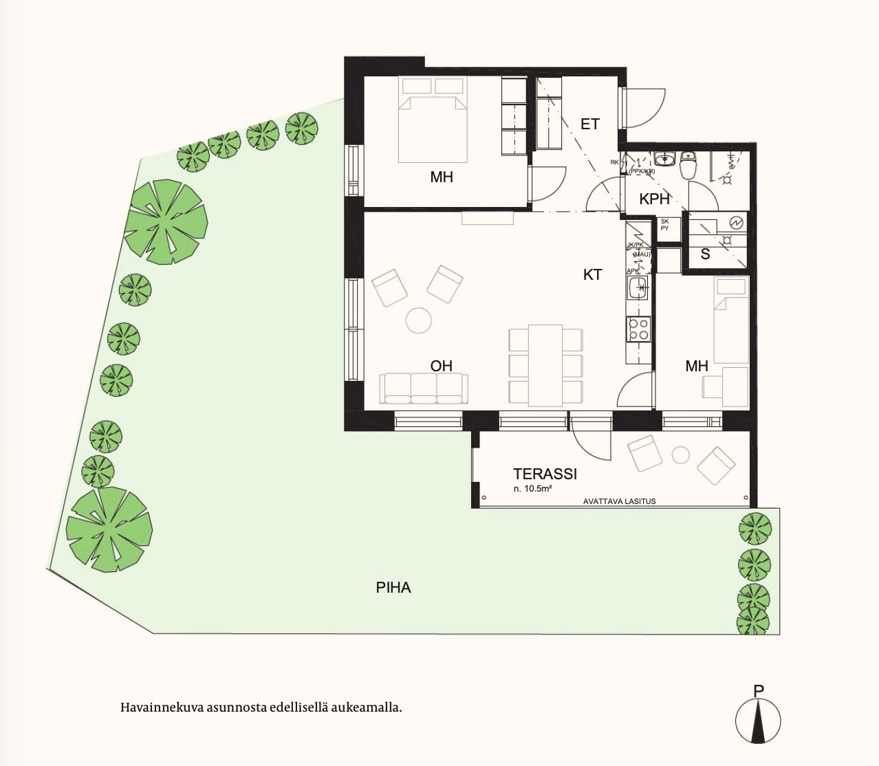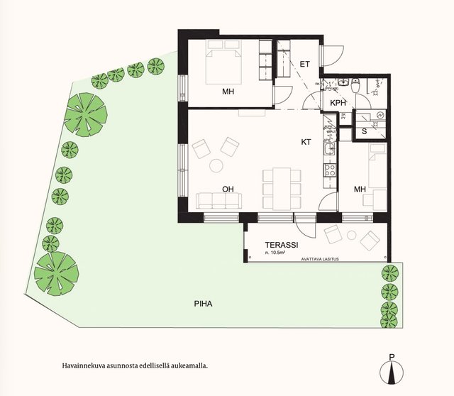 - Oma terassi n. 10,5 m2 sekä oma nurmikkopiha