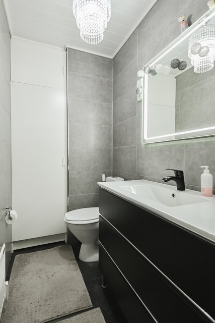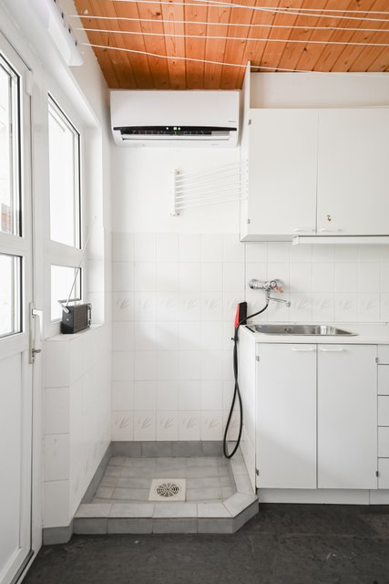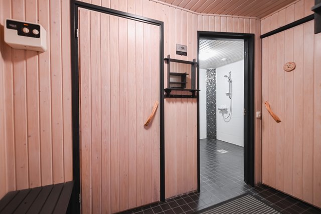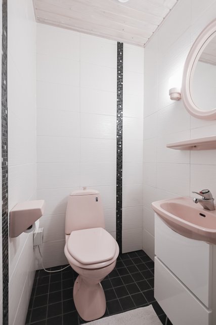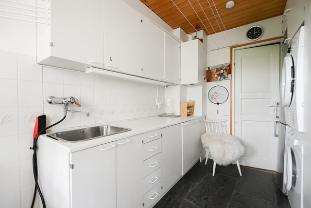 - Pesukone, kuivausrumpu, kurapiste, pesuallas, lattialämmitys, pesukoneliitäntä, ja tila pesutornille