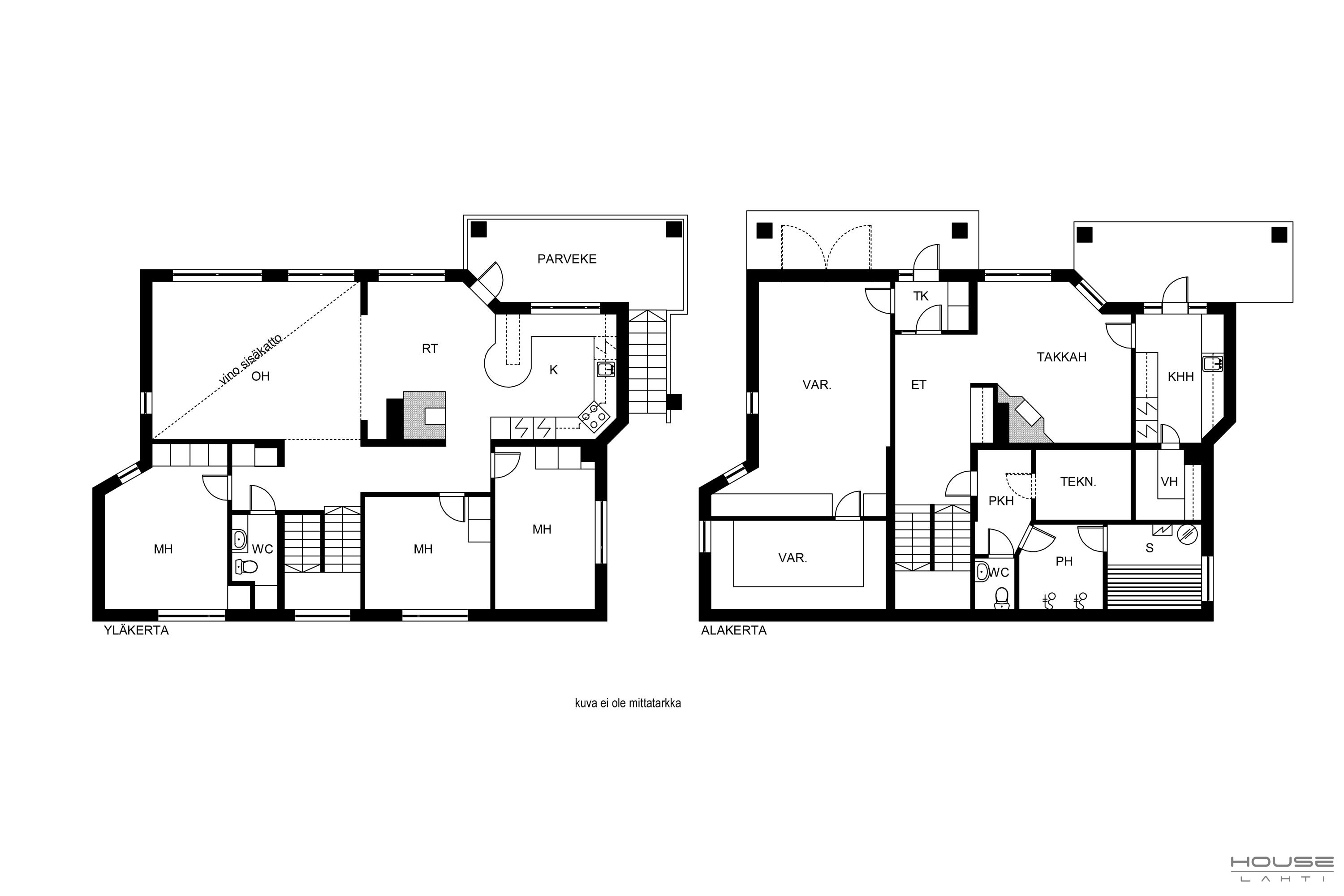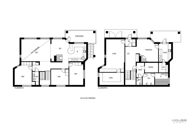 Oh, k, 3 x mh, takkah, 2 x wc, pkh, kph, s, khh, vh, autotalli joka harrastustilana