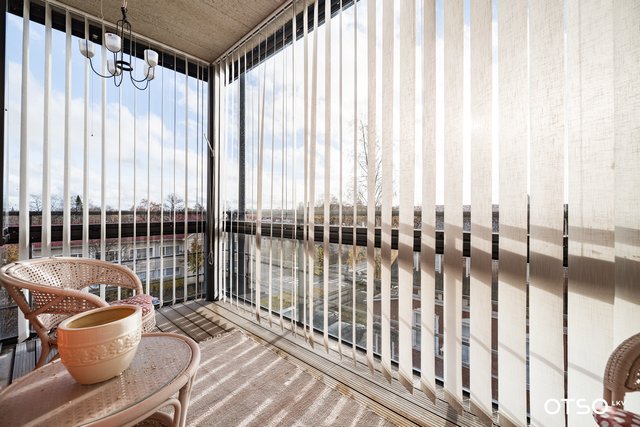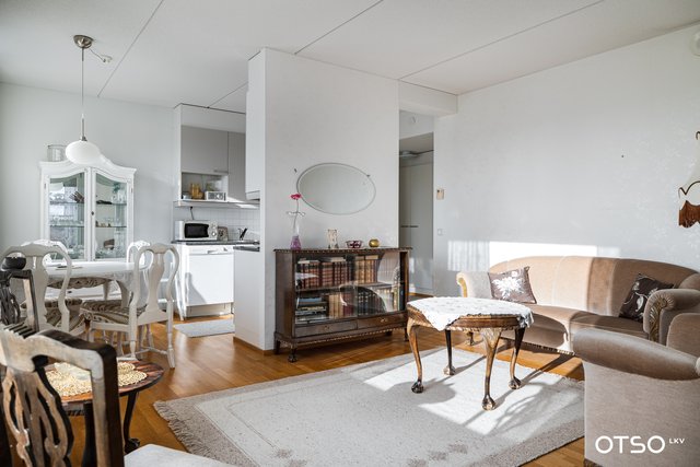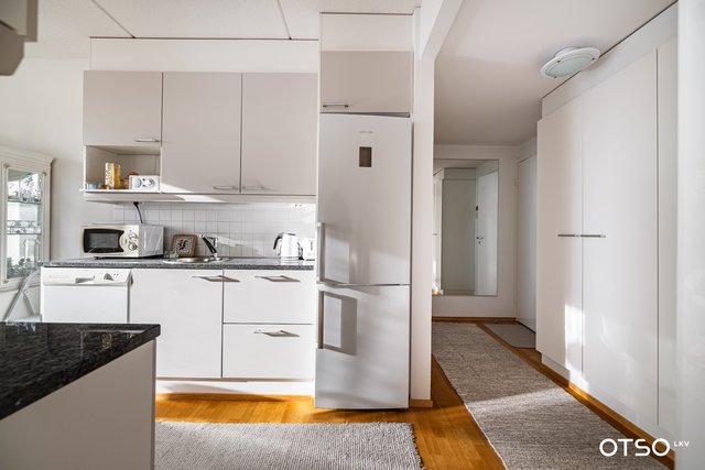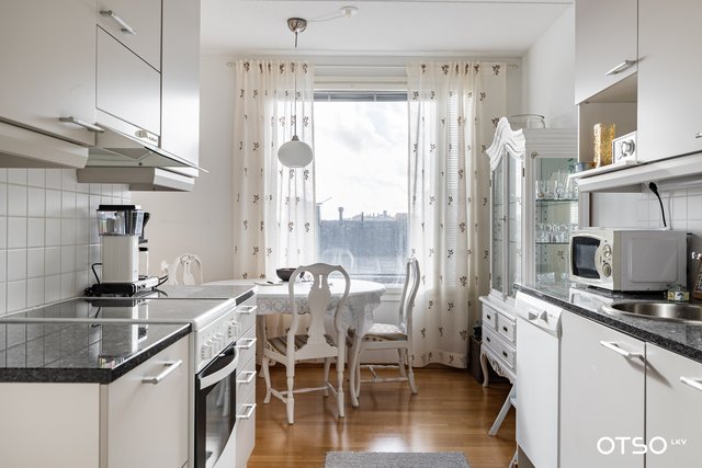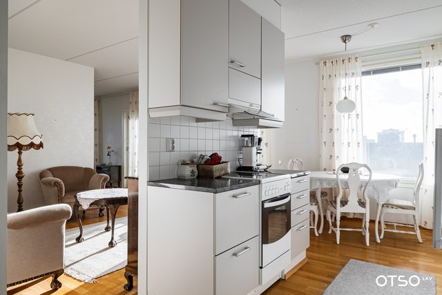 Keittiö on osin auki olohuoneeseen, tunnelma on valoisa ja kodikas, tilantuntua lisää olohuoneen jatkeena oleva iso parveke.