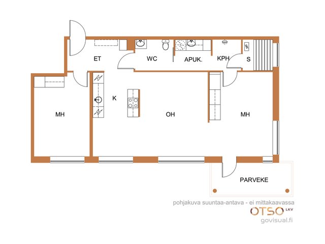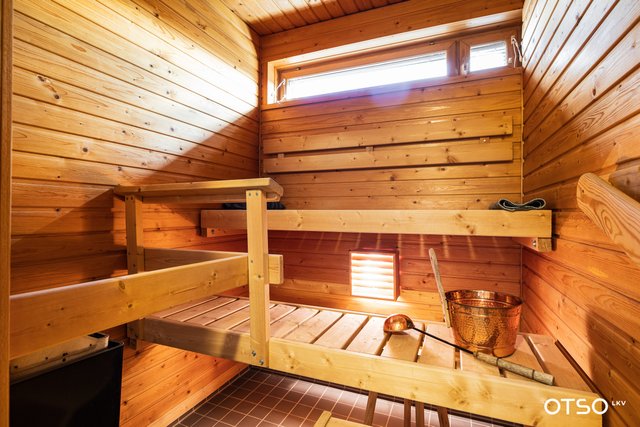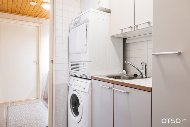 - Pesukoneliitäntä, pesuallas, pyykkikaapit, pöytätaso, lattialämmitys, ja tila pesutornille