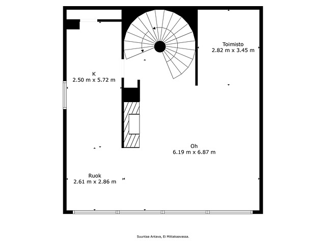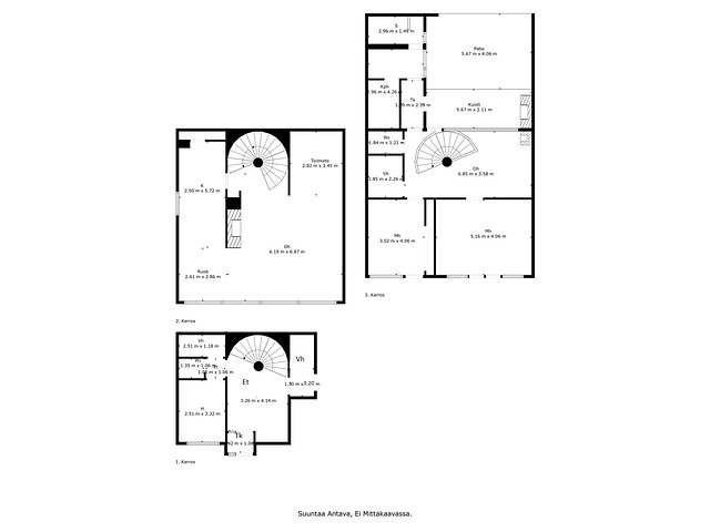 Keskikerroksessa takallinen olohuone, ruokailutila, keittiö, kylmähuone, työhuonetila (muunnettavissa huoneeksi).