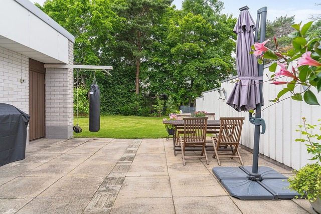 Pihalla patio, ulkotakka, leikkimökki, iso nurmikkoalue (kaksi omenapuuta, kirsikkapuu, luumupuu ja kaksi mustaherukkapensasta). Pihalta rappuset sisääntulokerrokseen.