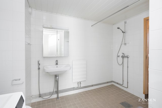 - Kylpyhuoneessa on allas, peilikaappi ja suihku. Lattiat on laattaa ja seinät on kaakeloitu.