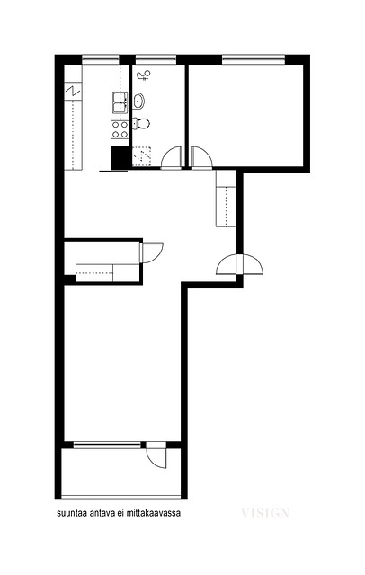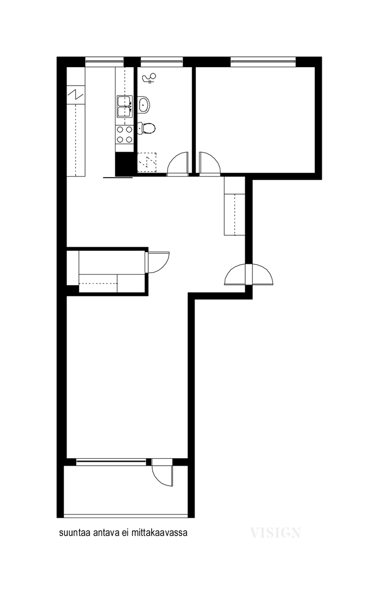 Tilava 2 krs:n läpi talon oleva kaksio, jossa toimiva pohjaratkaisu. Parveke länteen.