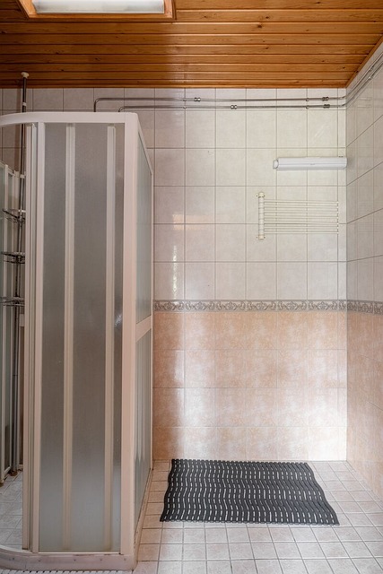 - Suihkukaappi, lattialämmitys, suihku, pesukoneliitäntä, ja peili