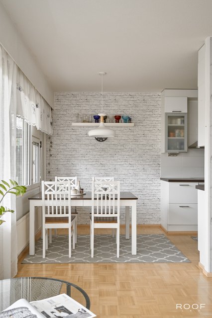 - Tuulikaappi: Laattalattia. Eteinen ja ruokailutila: Parkettilattia.