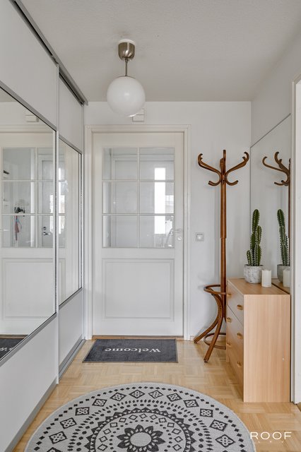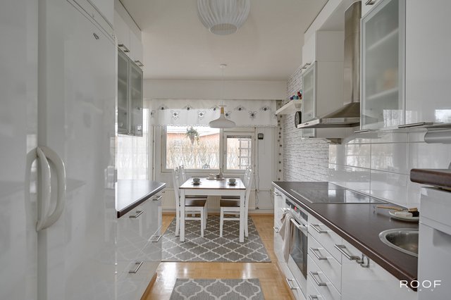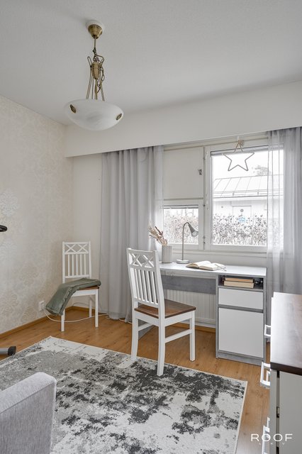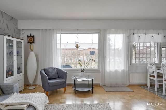 Kaksi mukavan kokoista makuuhuonetta, joista toisen yhteydessä on vaatehuone. Tilavasta olohuoneesta on kulku puiston puolella olevalle terassille. Ruokailutilassa on oma paikkansa ruokapöydälle. Erillinen kodinhoitohuone ja wc tuovat toimivuutta arkeen ja oma sauna kruunaa kokonaisuuden. Huoneistoon kuuluu autokatospaikka ja huoneiston käytössä on varasto.