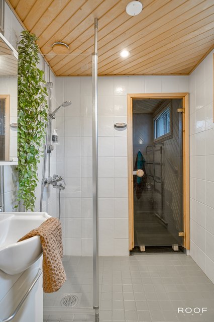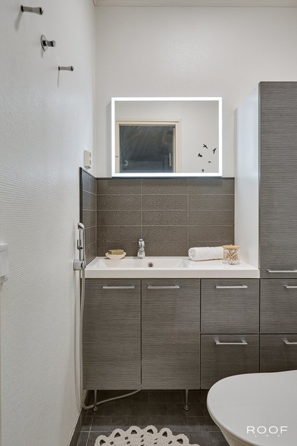 - Lattialämmitys (sähkö), suihku, suihkuseinä, peilikaappi, allaskaappi, ja pyyhekuivain