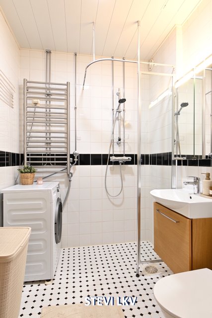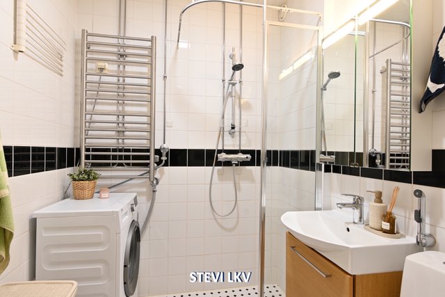 - WC-istuin, suihku, suihkuseinä, pesukoneliitäntä, peilikaappi, pesuallas, allaskaappi, ja bidee-suihku