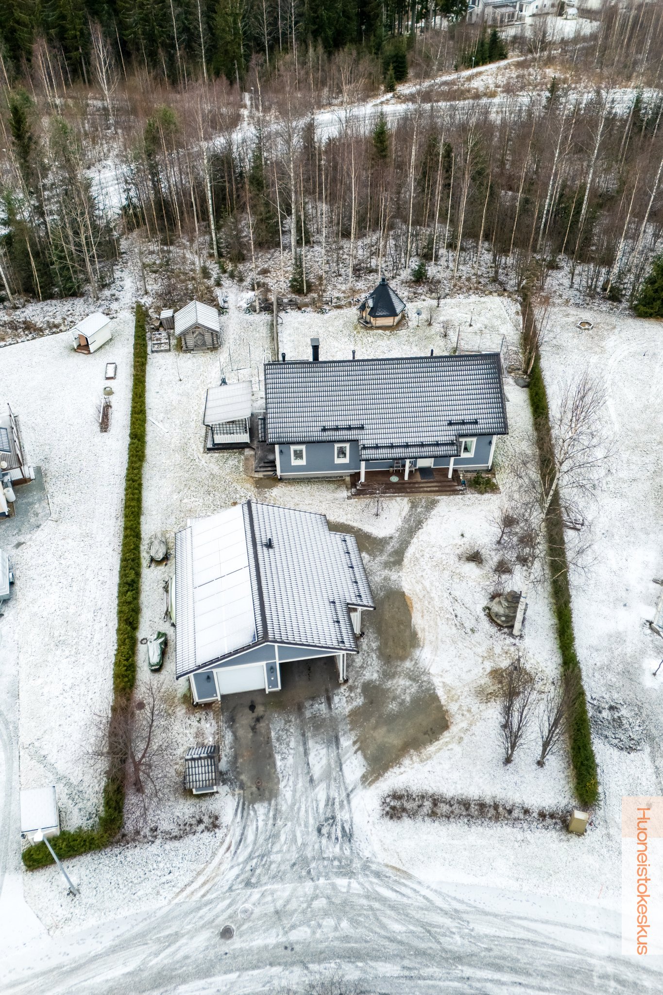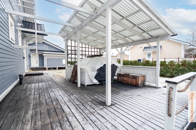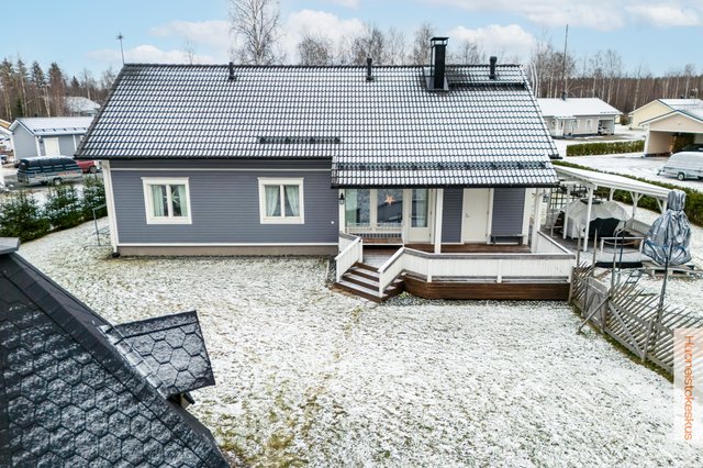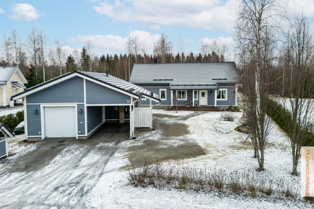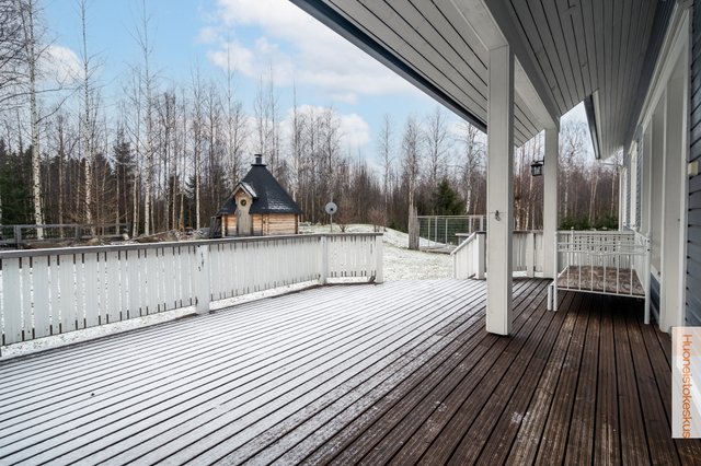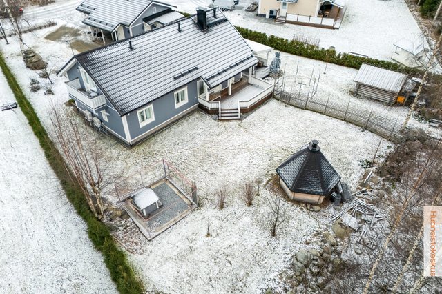 - Talousrakennuksen kerrosala 60m2. Grillikota 9m² (sähköistetty). Pinta-alatiedot saatu myyjältä ja rakennuspiirustuksista. Autotallissa on vesipiste sisällä omalla lämminvesivaraajalla sekä vesiposti ulkopuolella. Autotallissa myös ilmalämpöpumppu sekä lisälämmönlähteenä sähköpatterit. Päärakennuksen lämmitystä ohjaa HomeControl-kodinohjausjärjestelmä, jossa myös kulunvalvonta, sekä palo- ja vesiturvahälytykset. Autokatoksessa on tehokas (3-vaihe) ja nykyaikainen (etäohjattava) sähköauton latausasema.
