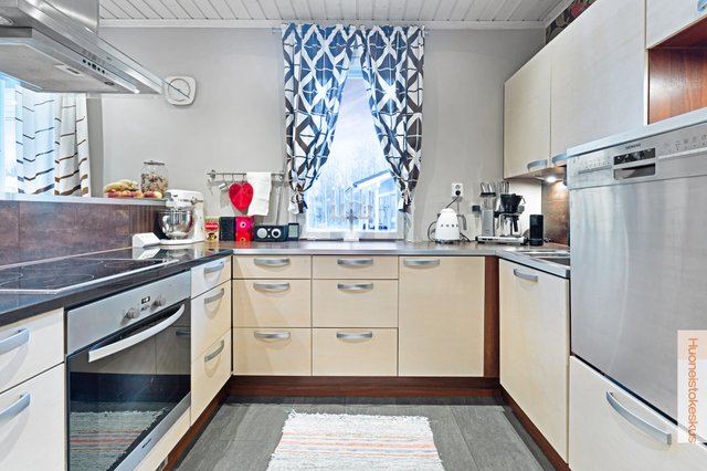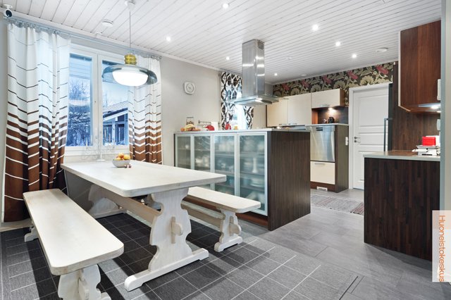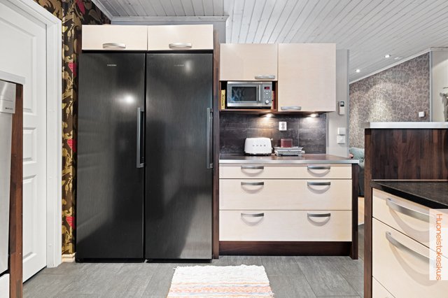- Jääkaappi (uusittu v.2022), erillinen pakastin (uusittu v.2022), liesituuletin, astianpesukone (uusittu v.2018), keittiösaareke, erillisuuni, ja liesi