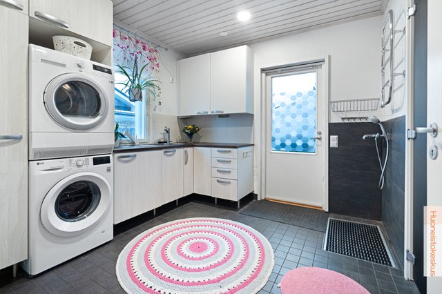 - Lattialämmitys, pesuallas, lattiakaivo, kurapiste, pöytätaso, pyyhekuivain / seinäpatteri, pesukoneliitäntä, keskuspölynimuri, pyykkikaapit, ja tila pesutornille