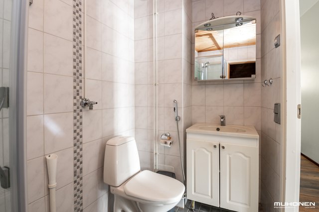 - WC-istuin, suihku, lattialämmitys, pesukoneliitäntä, suihkuseinä, pesuallas, ja peilikaappi