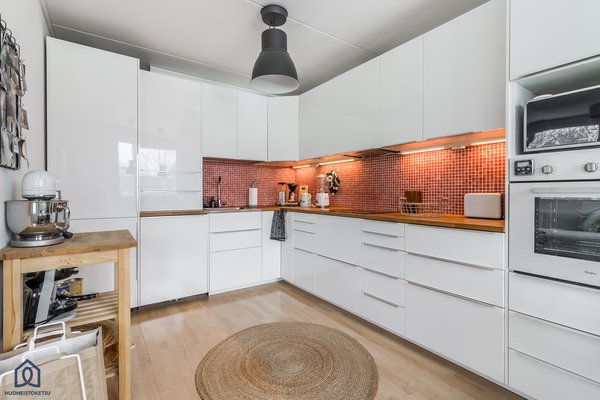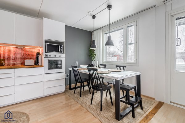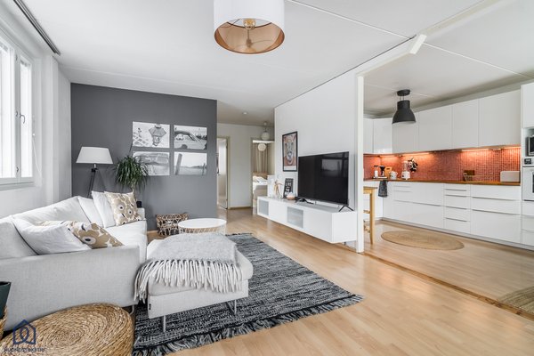 Tilava ja valoisa koti, jossa on kolme makuuhuonetta. Asunto on hyvässä kunnossa ja mm. keittiön kalusteet ja koneet on uusittu 2015. Keittiön ja olohuoneen välinen oviaukko on suurennettu ja näkymä tilojen välillä on avoin. Keittiön puolelle mahtuu isokin ruokapöytä, lasitettu parveke on sisäpihan puolelle ja kaksi wc:tä lisää arjen asumisviihtyvyyttä.