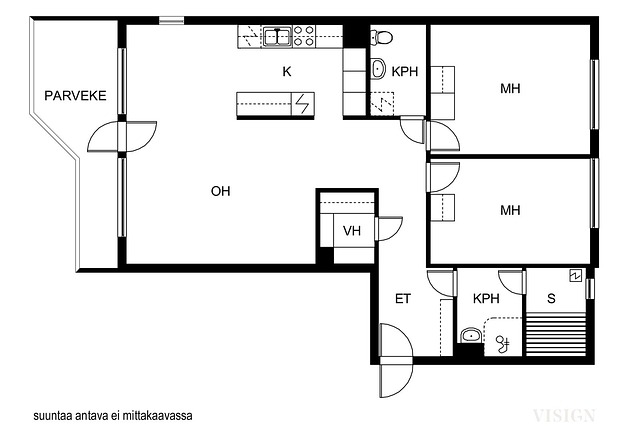 3 h, k, wc, kph/s, lasitettu parveke (yj. 3 H+K+S)