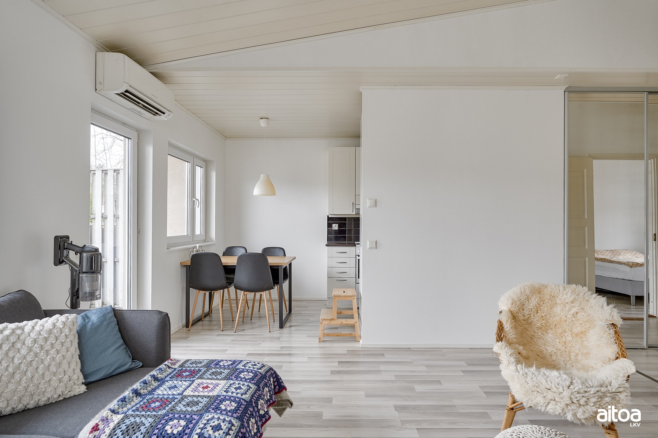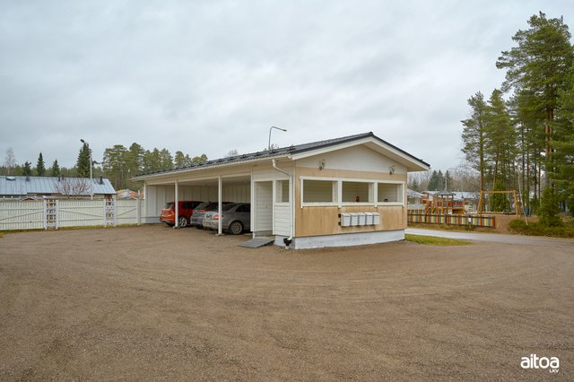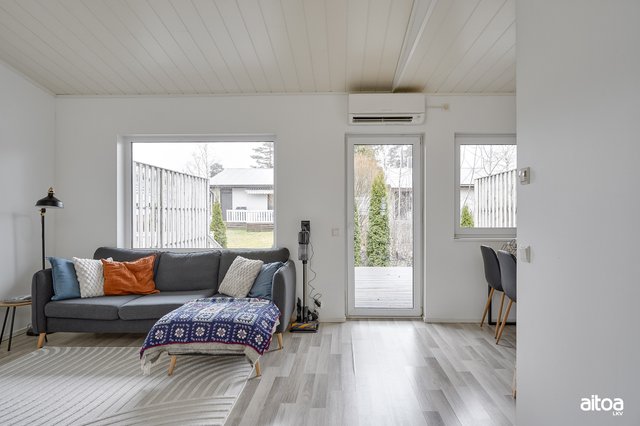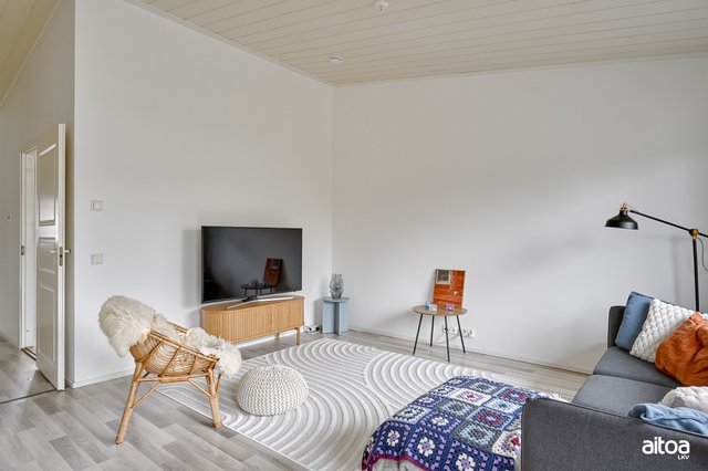 Huoneisto on kooltaan 53 m², mutta tuntuu tätäkin avarammalta, kiitos olohuoneen ja makuuhuoneen vinon sisäkaton, joka tuo tilantuntua. Taloyhtiö lämpiää sähköllä, jonka tueksi tähän huoneistoon on asennettu ilmalämpöpumppu. Valoisasta huoneistosta löytyy säilytystilaa niin eteisestä kuin makuuhuoneestakin, joiden lisäksi on huoneistokohtainen varasto ja autolle katospaikka.