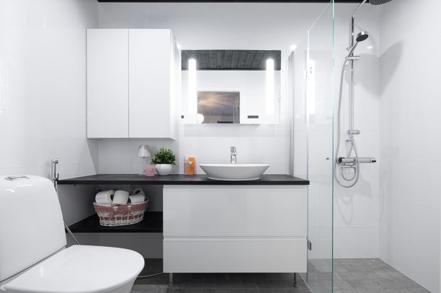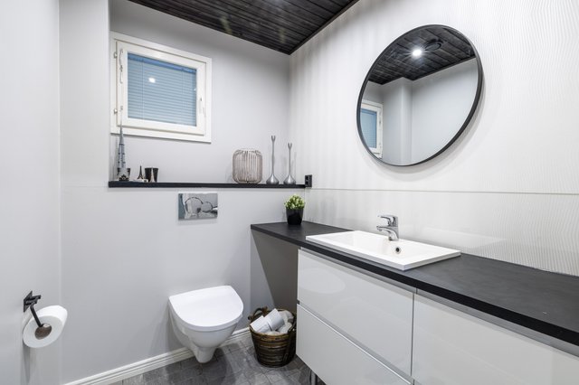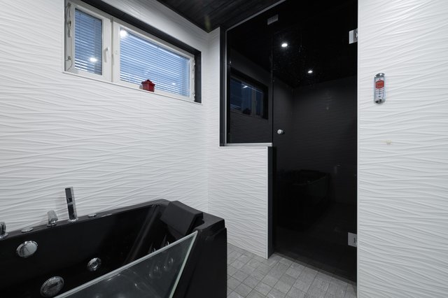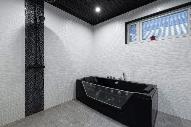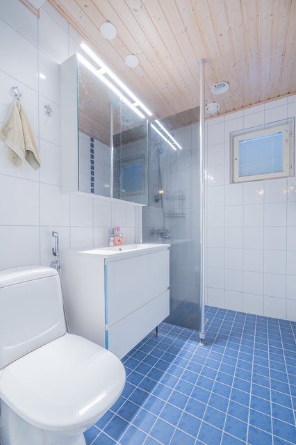 - Yläkerrassa erillinen kylpyhuone, missä poreamme ja suihku. Alakerrassa kylpyhuone, jossa WC-tila (suihkuseinä, suihku, WC-istuin, pesuallas, allaskaappi, bideesuihku ja peilikaappi). Yläkerrassa makuuhuoneen vieressä kylpyhuone, jossa WC-tila (suihkuseinä, suihku, WC-istuin, pesuallas, allaskaappi, bideesuihku ja peili).