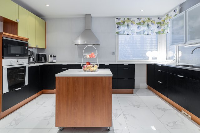 - Jääkaappi, erillinen pakastin, liesi, erillisuuni, mikroaaltouuni, liesituuletin, ja keittiösaareke (siirreltävä)