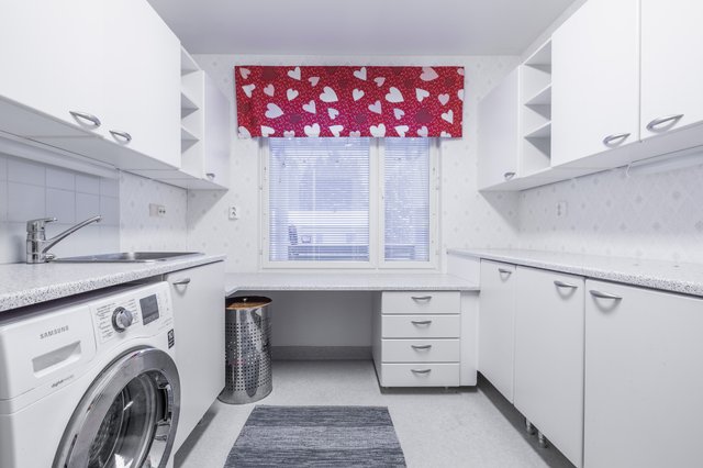 - Pesukoneliitäntä, lattialämmitys, pesukone, pesuallas, lattiakaivo, pöytätaso, ja keskuspölynimuri (ei ole ollut käytössä, huolto tarpeen)