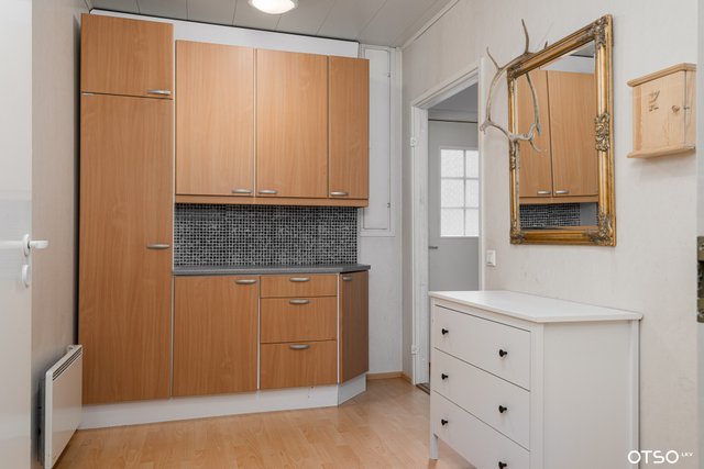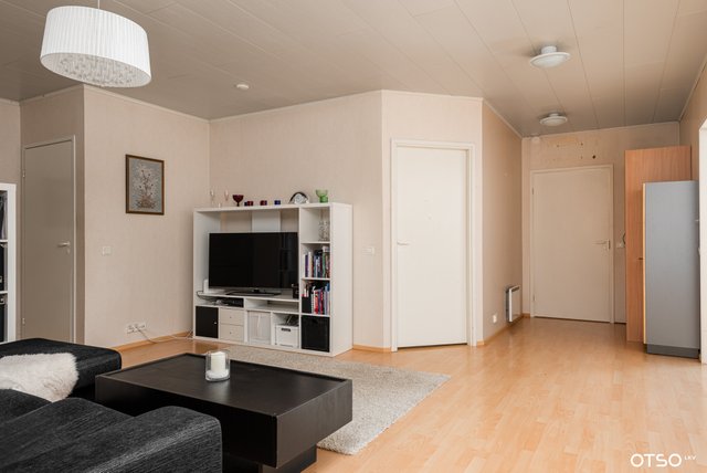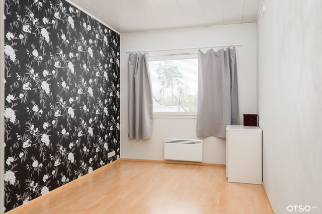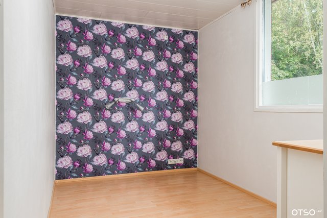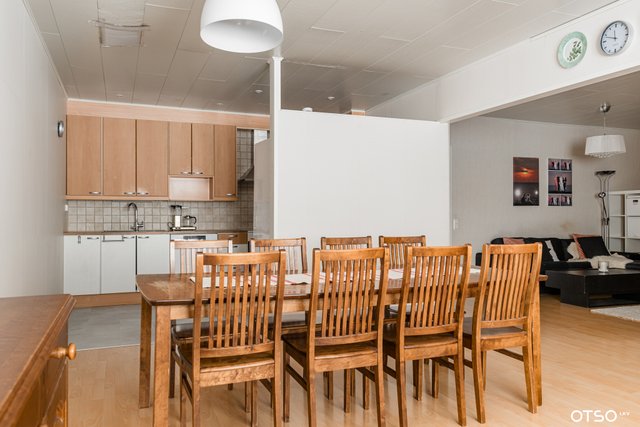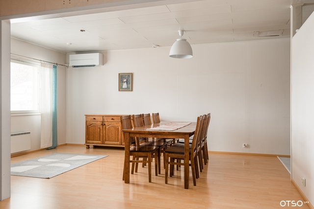 Kolme hyvänkokoista makuuhuonetta ja mahtavan tilava yhteinen olohuone- ruokailutila- keittiö, joka kerää kyllä isommankin porukan yhteen. Huonetilat ovat siistit ja muutos asunnoksi on tehty 2000-luvun alussa.