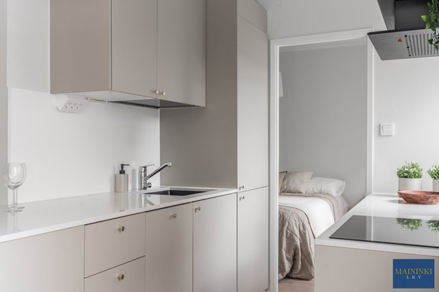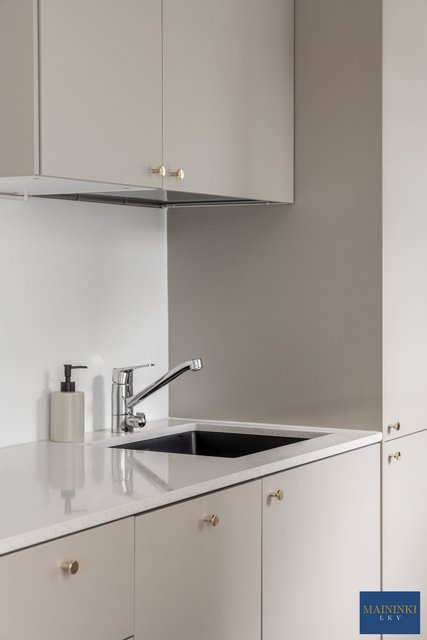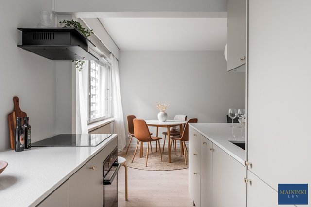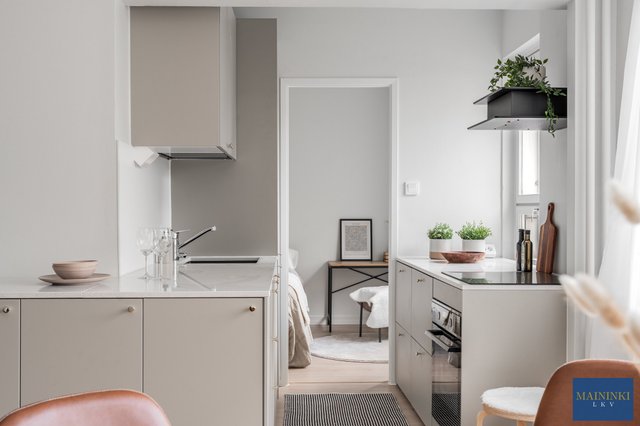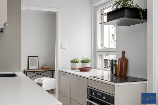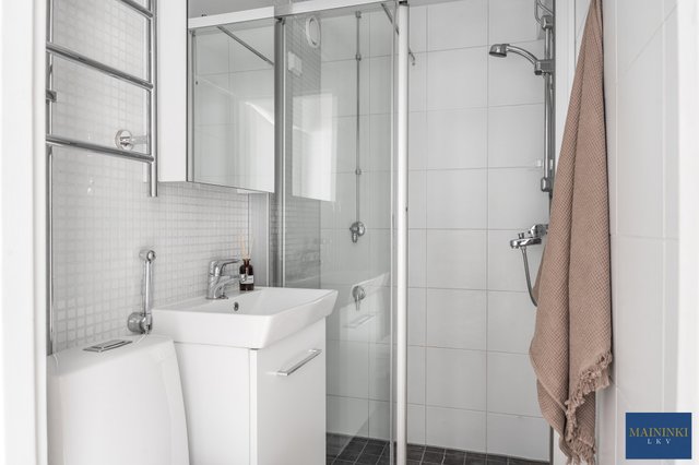 Keittiö on varusteltu modernisti - käytössäsi on mm. energiatehokas induktioliesi ja uuni sekä astianpesukone. Työtasot ovat kvartsikomposiittia, joten ne kestävät kulutusta. Linjasaneerauksen yhteydessä peruskorjatussa kylpyhuoneessa on lattialämmitys ja tilaa pesukoneelle, mikä tekee arjesta sujuvaa. Säilytystilaa on hyvin makuuhuoneen ja eteisen kaapistoissa.