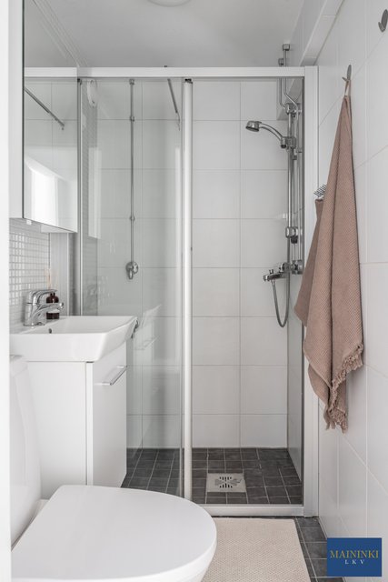 - WC-istuin, suihkuseinä, suihku, pesukoneliitäntä, peilikaappi, pesuallas, allaskaappi, bidee-suihku, lattialämmitys, ja pyyhekuivain
