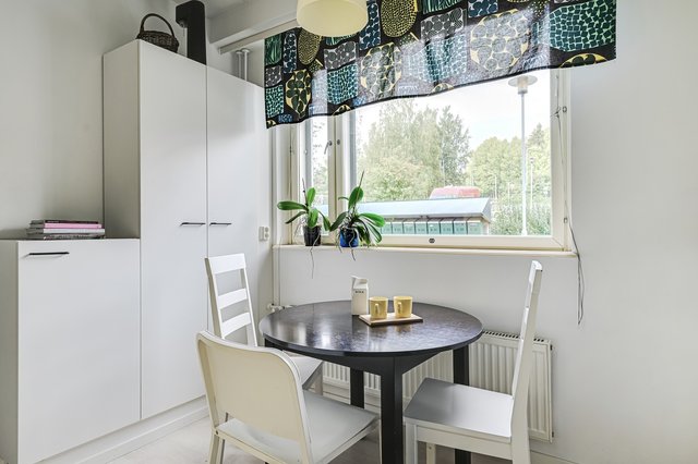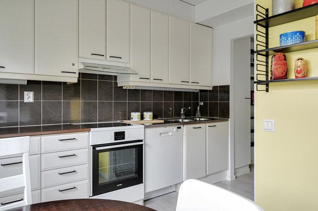 - Eteinen: lattia laattaa ja seinät maalattu, tilassa kaapistot.