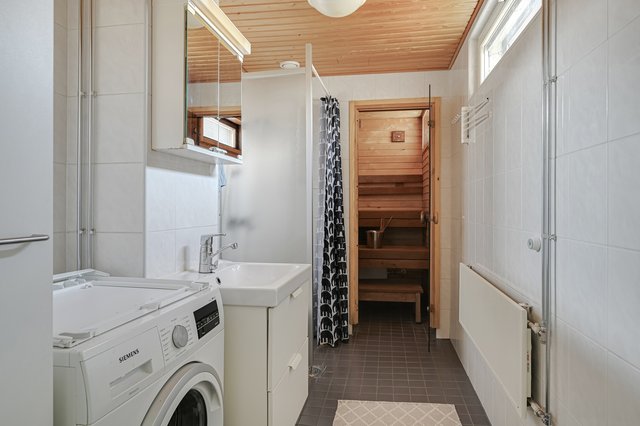 - WC-istuin, suihku, suihkuseinä, pesukoneliitäntä, lattialämmitys, peilikaappi, pesuallas, allaskaappi, bidee-suihku, ja pyykkikaappi, tila pesutornille, tilassa ikkuna.