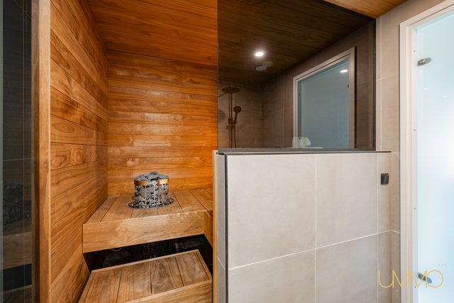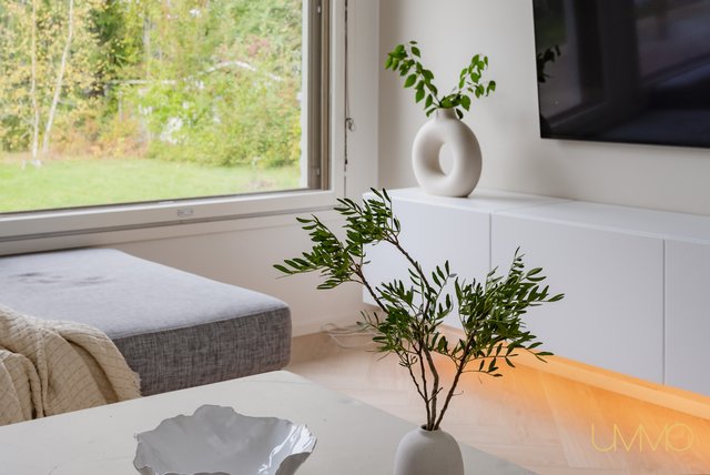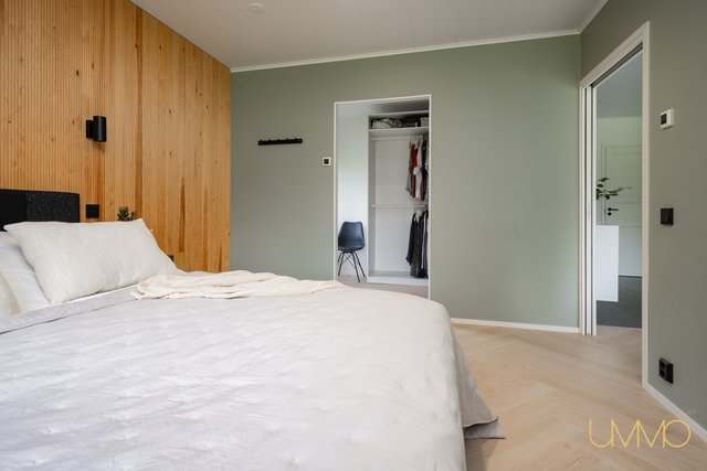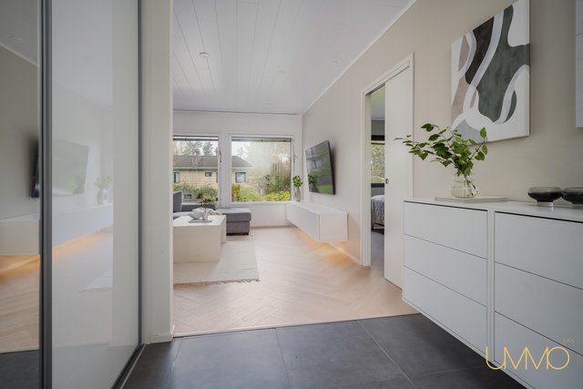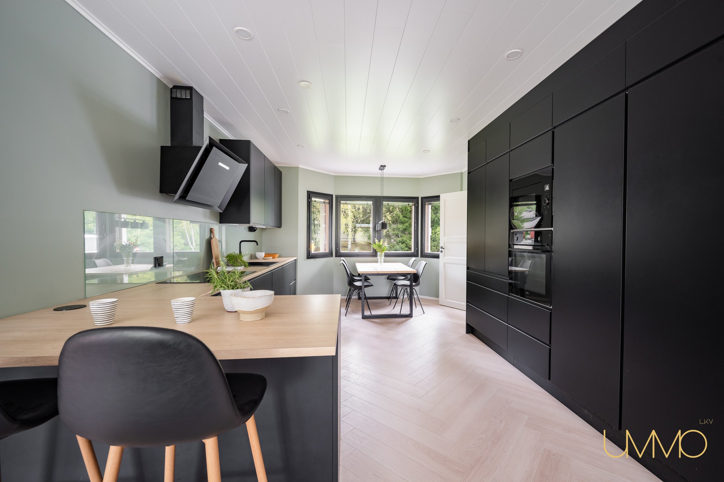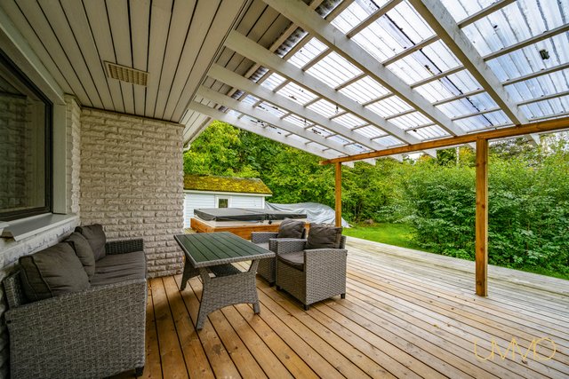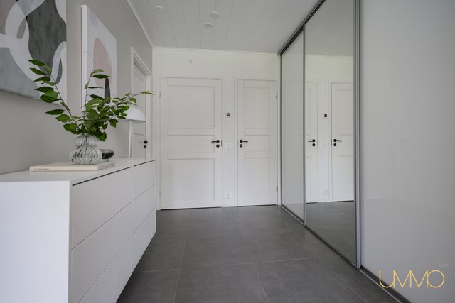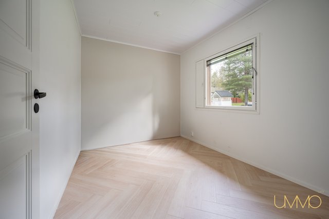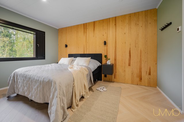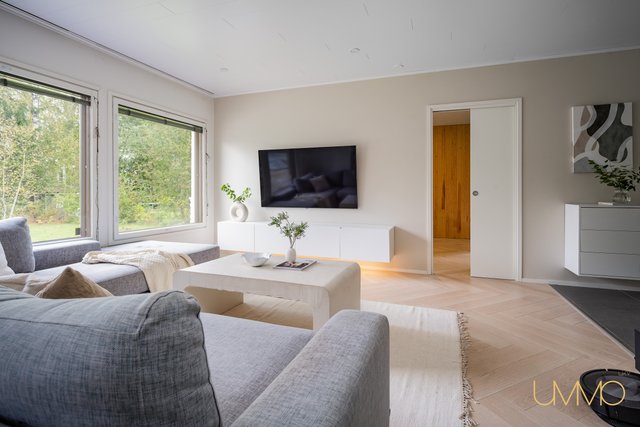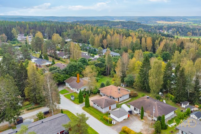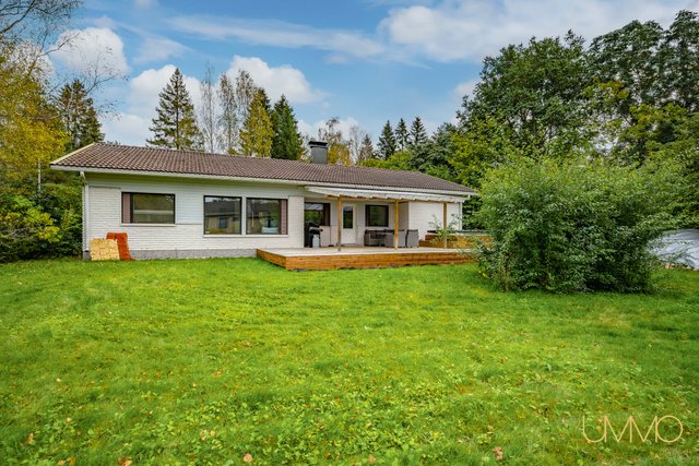 Koti yhdessä tasossa, joka sijaitsee päättyvän tien viimeisenä talona. Kodista löytyy kaksi makuuhuonetta. Päämakuuhuoneen yhteydessä erittäin iso vaatehuone. Keittiö ja olohuone ovat yhtenäistä avaraa tilaa. Olohuoneen vieressä on takkahuone, joka toimii nykyisellä asukkaalla työtilana. Takkahuoneesta kulku takapihan katetulle terassille. Kodinhoitohuoneessa on tilaa pyykinpesukoneelle sekä kuivausrummulle. Kodinhoitohuoneessa kodin toinen wc-istuin. Kylpyhuoneesta löytyy kaksi sadesuihkua. Oma sauna, jossa komeilee radiatamänty, jonka parhaimpiin ominaisuuksiin kuuluu kaunis tumma väri, elävä pinta ja helppo työstettävyys. Talon yhteydessä lämmin autotalli noin 27 m2.