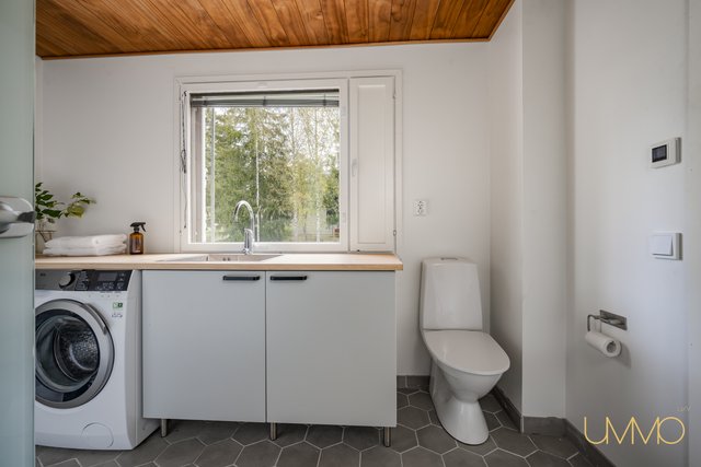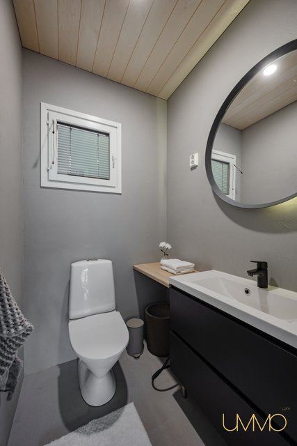 - Mikrosementti vuonna 2022 (laitettu vanhan laatan päälle). Kalusteet uusittu 2022. Lattia ja seinät: Mikrosementtiä. Katossa kuusipaneelia (2022) Kodinhoitohuoneen yhteydessä toinen wc (lattia: laattaa. Seinät: Maali