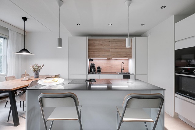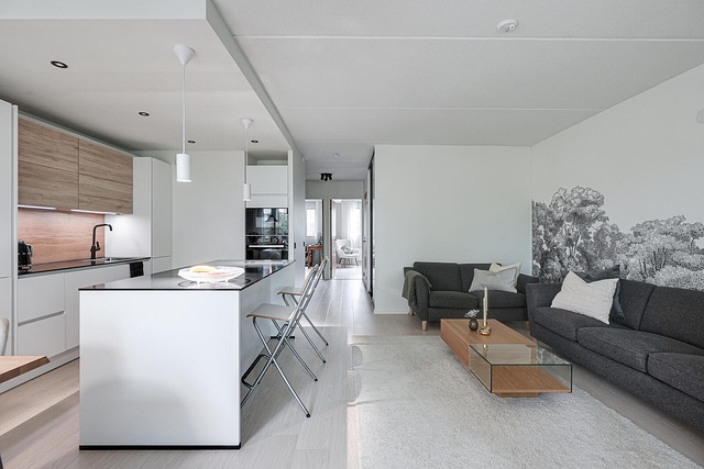 Upea iso avokeittiö tilavassa olohuoneessa, laadukkaat kivitasot ja laitteet.
