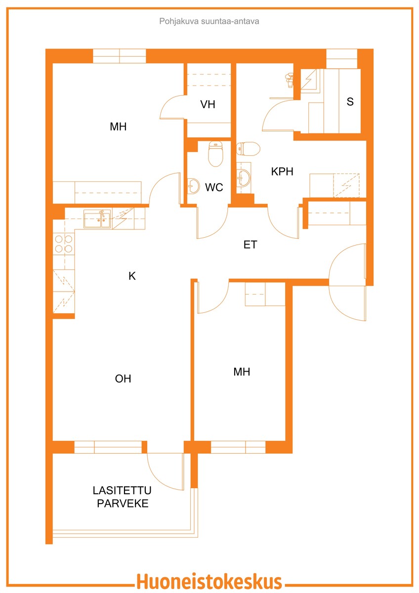 Selkeä, toimiva pohjaratkaisu tekee asumisesta helppoa ja miellyttävää. Olohuone ja keittiö muodostavat yhtenäisen tilan, jossa viihtyy niin arjessa kuin juhlassakin. Olohuoneesta on käynti lasitetulle parvekkeelle, joka toimii mukavana lisähuoneena alkukeväästä pitkälle syksyyn.