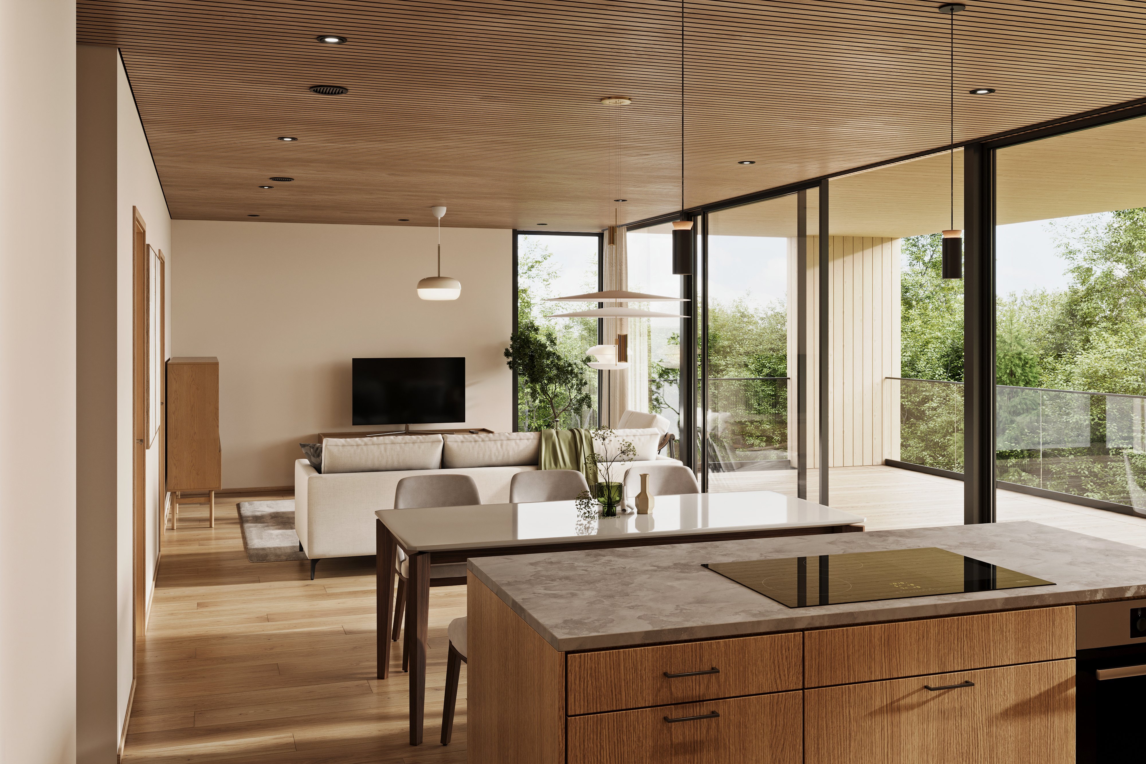 - Asunnossa on huippumoderni ja laadukas avokeittiö kivitasoineen, joka on erotettu ruokailu- ja oleskelutiloista leveän työtasosaarekkeen avulla. Kiinteät kodinkoneet ovat integroitu kaapiston sekaan. Voit valita Ideal keittiön kaapistot rakennuttajan vakiomallistosta oman makusi mukaan, niin vaalean tai tumman puun, kuin upean mustan, valkoisen tai kauniin beigen sävyn mukaan. Voit päättää jokaisen yksityiskohdan itse vetimistä lähtien, aina rakennuttajan kattavaan vakiomallistoon kuuluvan mustan, kromin tai kultaan taittavan hanan joukosta. Isoista liukuovista pääsee kodin tilavalle terassille ja sieltä oman pihan nurmikolle. Lattia: parketti valinnan mukaan Jalkalistat: mäntyjalkalista Seinät: tasoite ja maalaus, kalustevälissä lasi tai malamiini Katto: tasoitettu ja maalattu kipsilevykatto Kalusteet: vakiokalusteet kalustesuunnitelman mukaan Työtasot: laminaattia tai kiveä valinnan mukaan Varusteet: kodinkoneet kalustesuunnitelman mukaan, Induktio-liesitaso, työtasossa 1-altainen tasoon upotettu pesupöytä, komposiittia