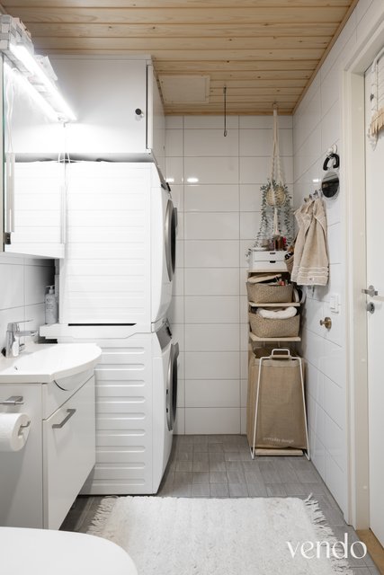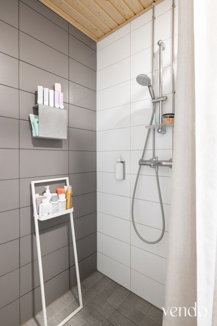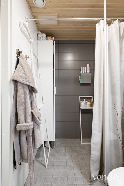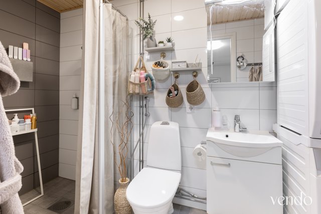 - WC-istuin, suihku, pesukoneliitäntä, peilikaappi, pesuallas, allaskaappi, ja bidee-suihku