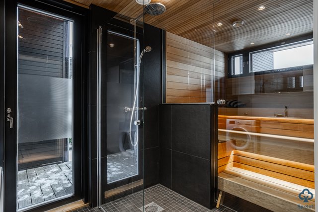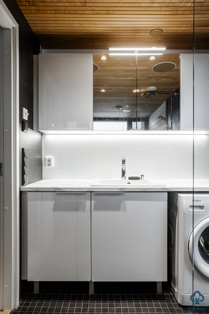 Kylpyhuone on suunniteltu erittäin tehokkaasti ja tila palvelee erinomaisesti sekä kodinhoitohuoneena että arkieteisenä. Kylpyhuoneesta on nimittäin kulku suoraan ulos, joten sitä kautta onnistuu lenkille lähtö tai pyykkien kuivatus jne. Terassi kiertää myös takapihalta asunnon sivustalle asti, joten kylpyhuoneesta pääsee siististi terassin kautta suoraan porealtaan lämpöön. Ikuinen arkihaaste eli riittävä säilytystila on selätetty tässä asunnossa onnistuneesti. Eteiseen sekä makuuhuoneeseen on asennettu erittäin tilavat ja laadukkaat Noblessan kaapistot sekä säilytysratkaisut vuonna 2024. Tämän lisäksi asunnon yhteydestä löytyy oma lämmin varasto, jonne voi kulkea sukkasillaan katettua terassia pitkin. Varastossa on paljon arvokasta säilytystilaa ja tarvittaessa sitä voi käyttää vaikka etätyöpisteenäkin.