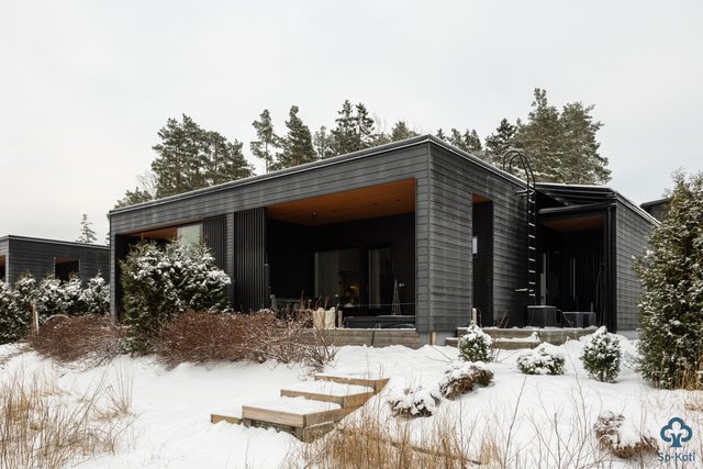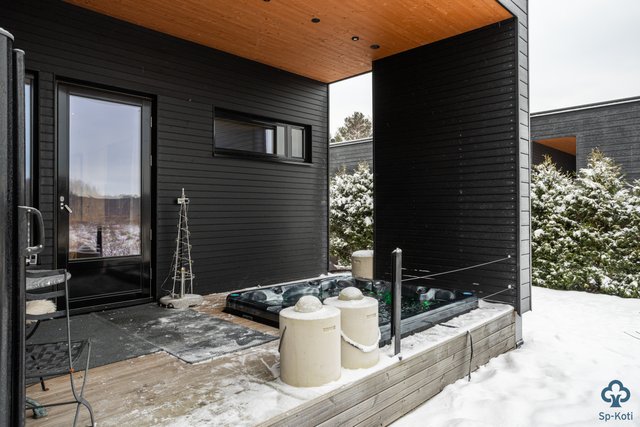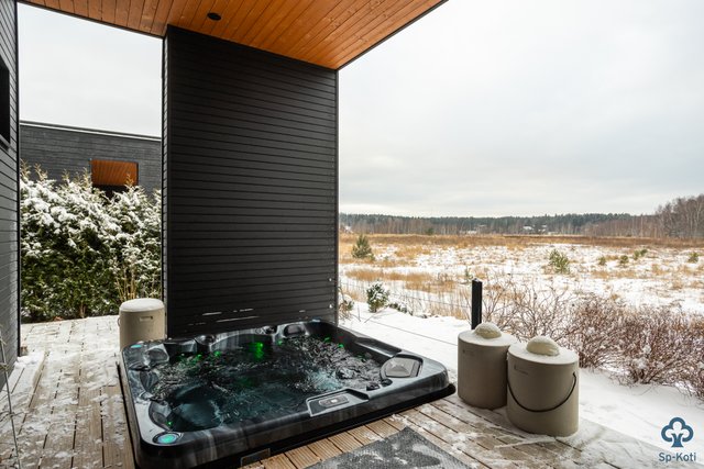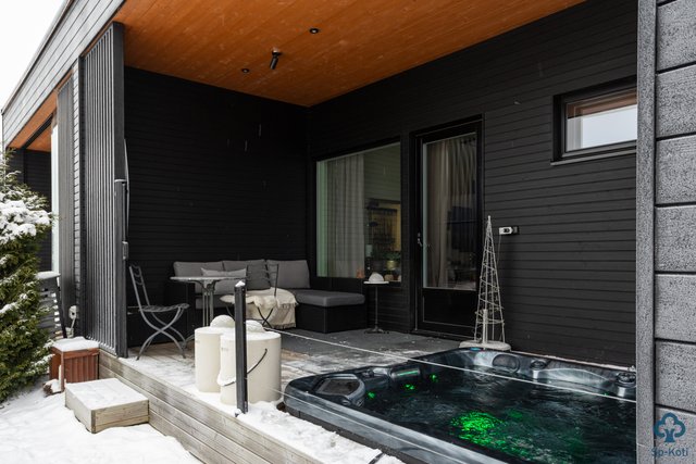 - Takapihalla viihtyisä katettu terassi, jossa lisäksi ulkoporeallas. Takapiha on luoteen suuntaan. Terassi kiertää myös asunnon sivustalle.